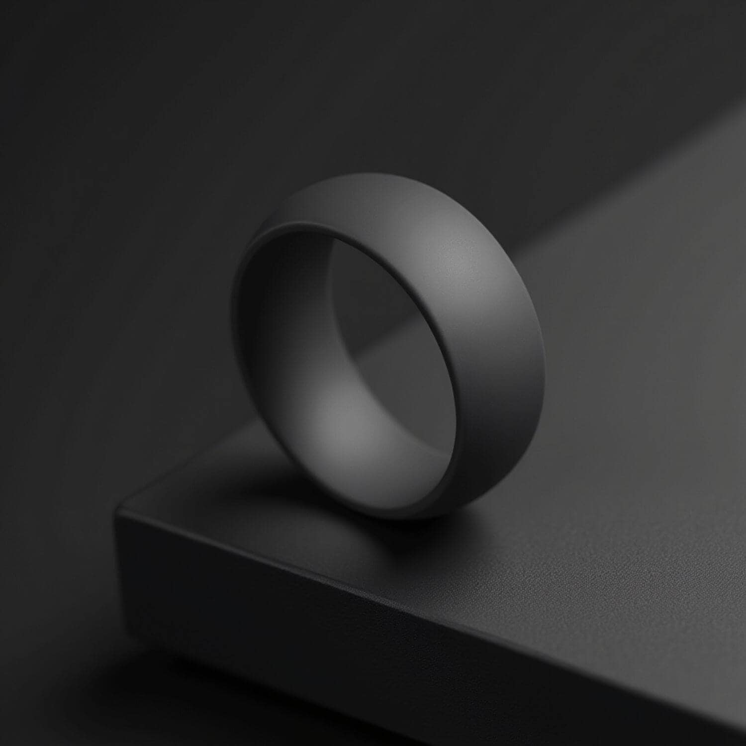 A charcoal grey medical-grade silicone band at 6mm or 8mm. Medical-grade silicone: hypoallergenic, flexible, MRI-safe, and safe in environments where metal rings are a hazard. A silicone ring for buyers who wanted the safety and practicality of silicone in a colour that is not quite black.