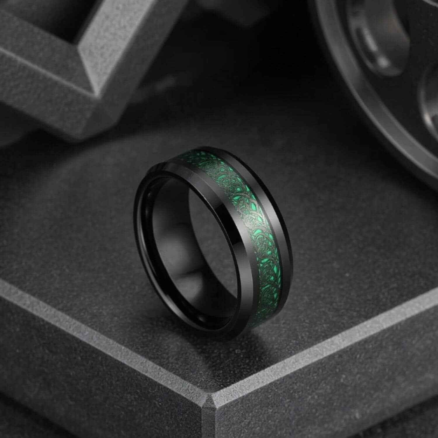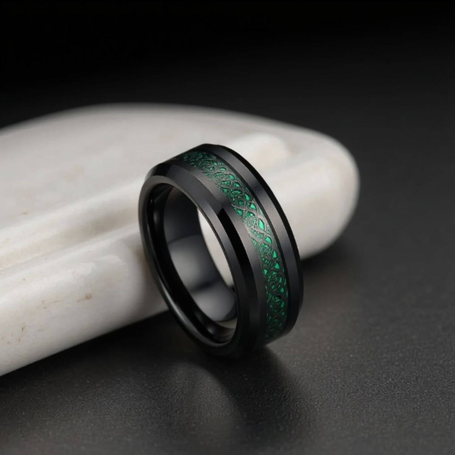Several buyers note the green is brighter in person than it appears in photos. The carbon fibre catches the light at different angles, giving the inlay movement.“The ring has lovely colouring and the black and green work very well together. The green inlay is quite bright in real life, more so than in the pictures. The green inlay catches the light very well and I have certainly not come across a ring like this before.” — Arthur Jones, Rochdale