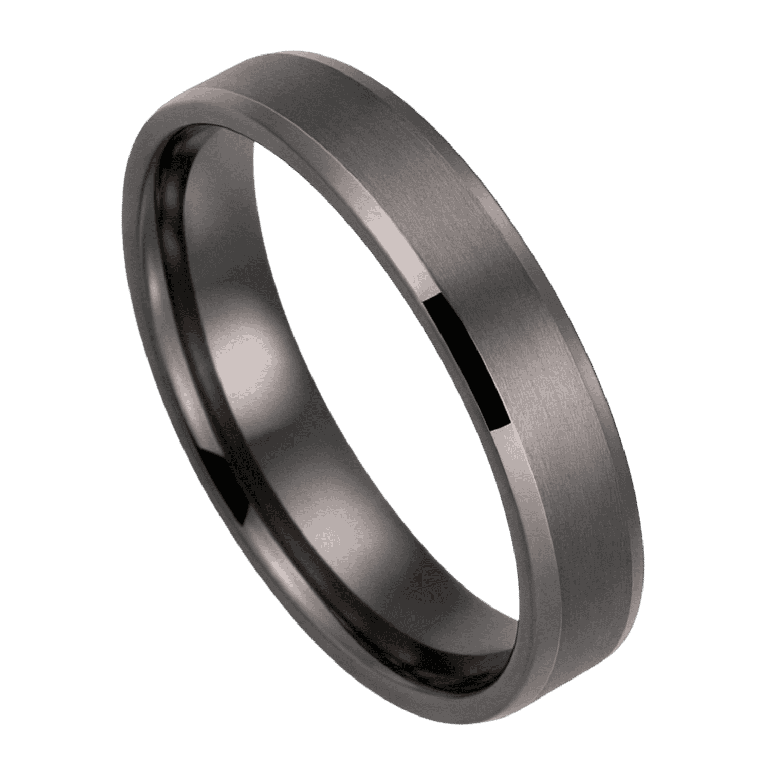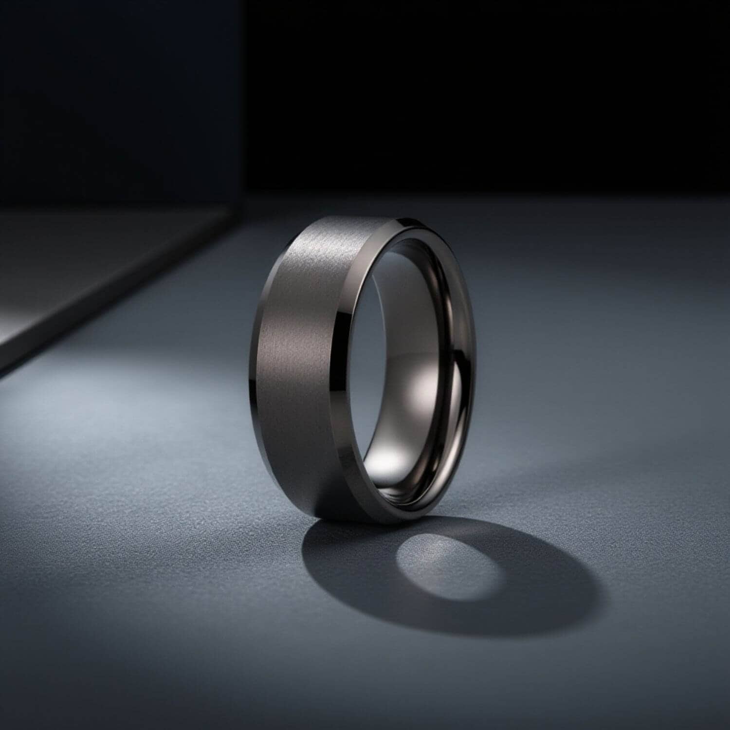 A gunmetal grey tungsten band with polished bevelled edges and a brushed centre. The bevelled edges catch the light while the brushed centre absorbs it — a contrast that gives the ring presence without pattern or colour variation. The gunmetal grey tone is slightly darker than it appears in photographs — closer to a dark steel than a mid-grey. Available in 6mm and 8mm. The 8mm is the bolder choice; the 6mm suits a slimmer hand or a more understated look.