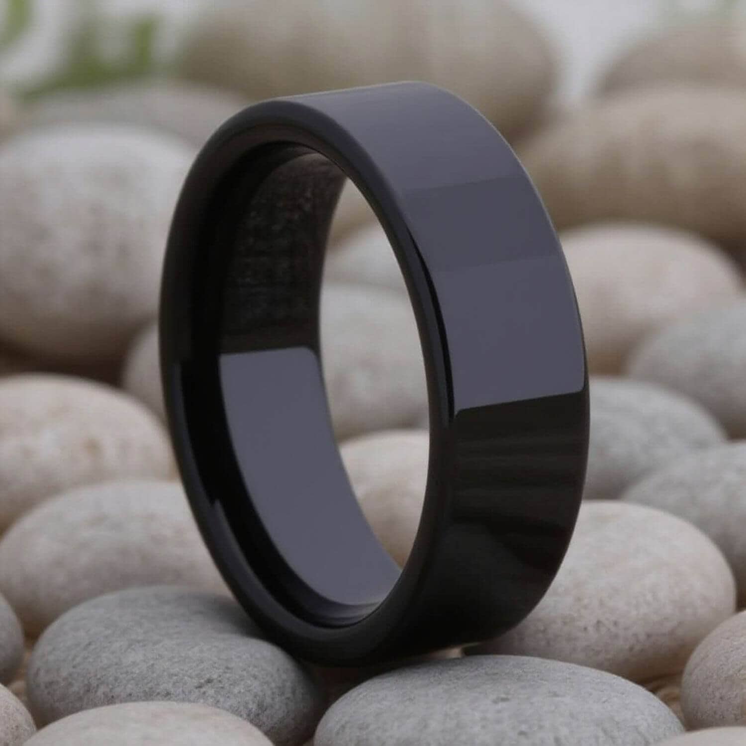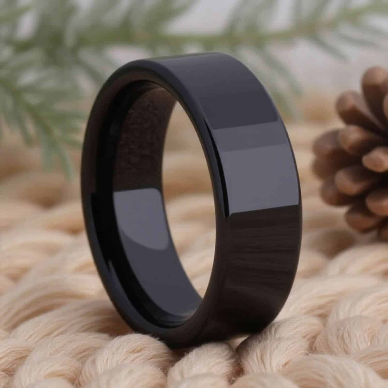The Ebony is a full polished black tungsten band at 8mm. One colour, one finish, nothing added.