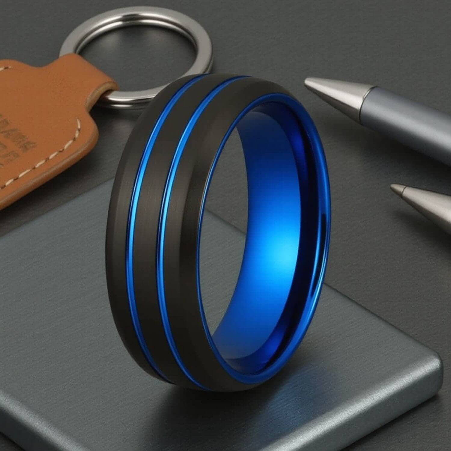 Black and blue PVD on tungsten carbide. Both finishes hold through daily wear.
