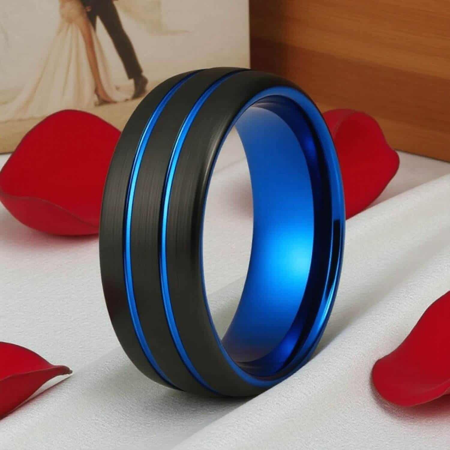 A black tungsten band at 8mm with a blue groove inlaid through the surface. Tungsten carbide is one of the hardest metals used in jewellery: it won’t bend, deform, or tarnish. A men’s wedding ring for buyers who chose black and blue and wanted a ring with both colours clearly defined: 20 reviews confirm it delivers: engravable, dispatched same day.