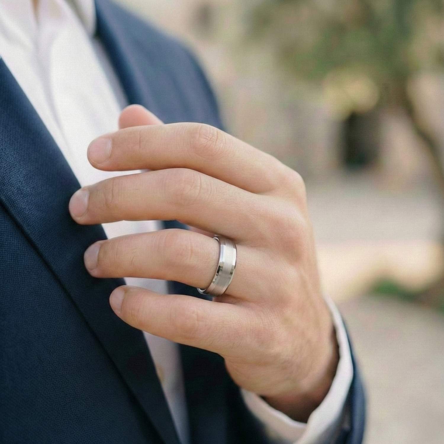 Made from premium tungsten carbide, this ring is engineered for durability and resilience. Scratch-resistant, tarnish-free, and built to withstand everyday wear, it maintains its shine and structure for years to come. The brushed white gold finish offers modern elegance, while the polished bevelled edges add that timeless touch of sophistication.