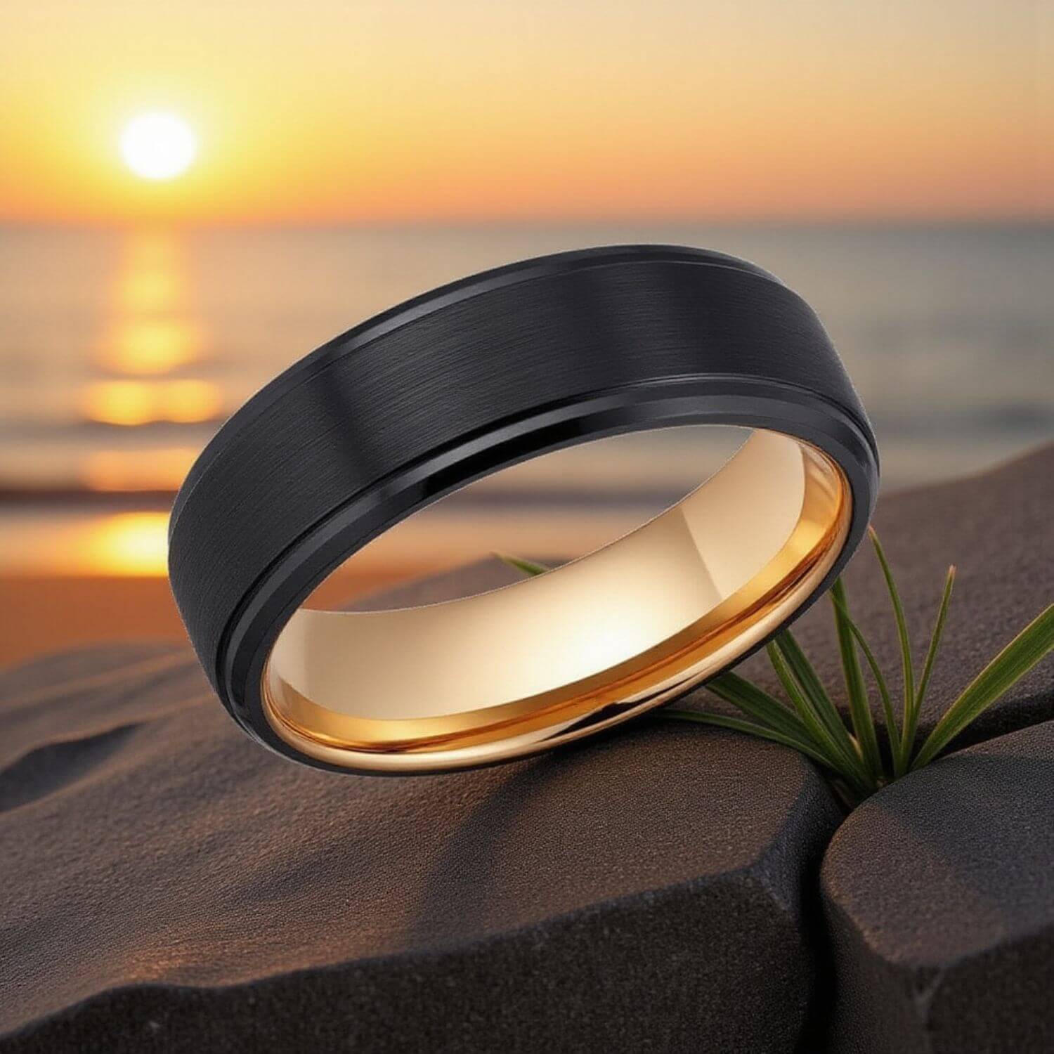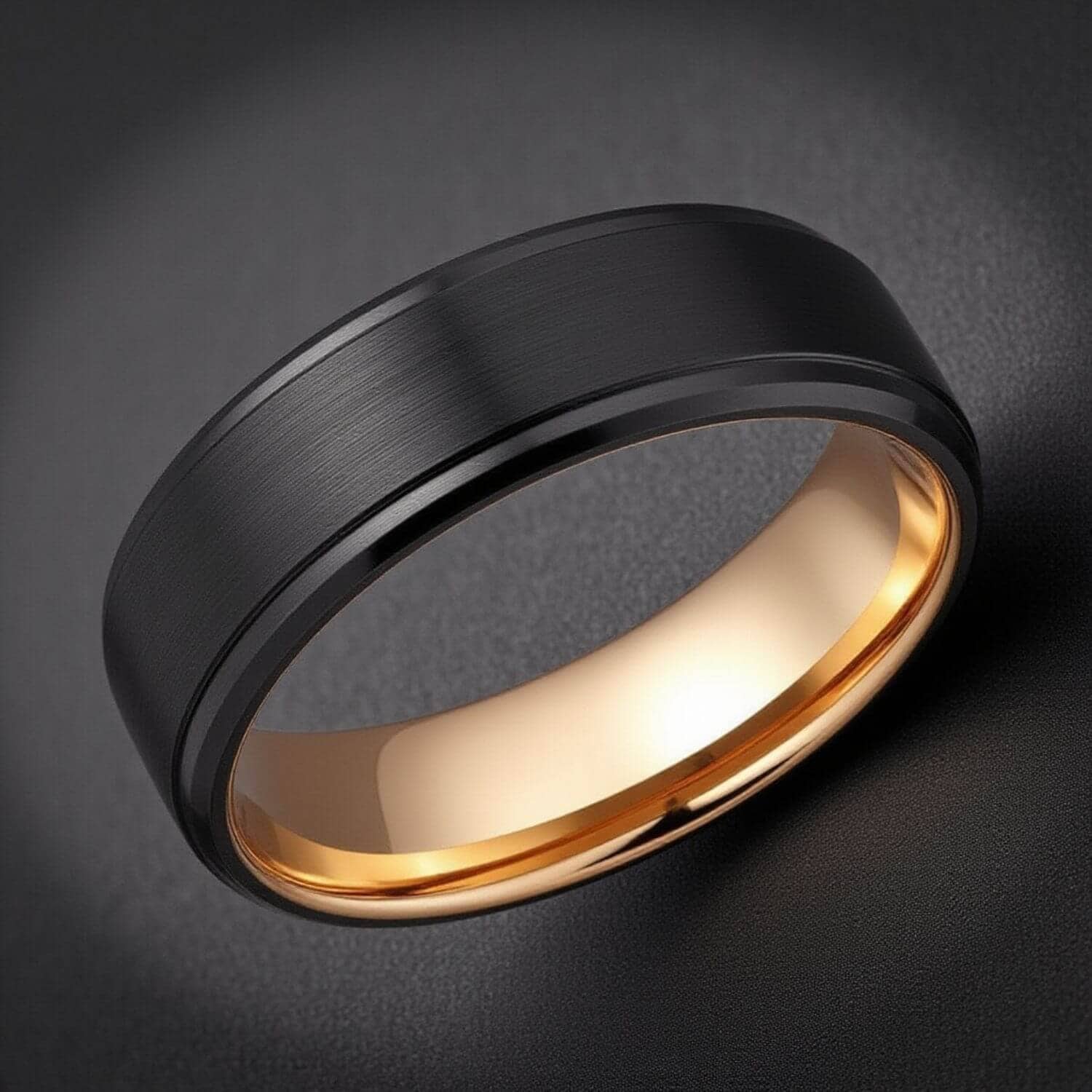 Black and rose gold PVD on tungsten carbide. Tungsten holds both at the groove boundary through daily wear.