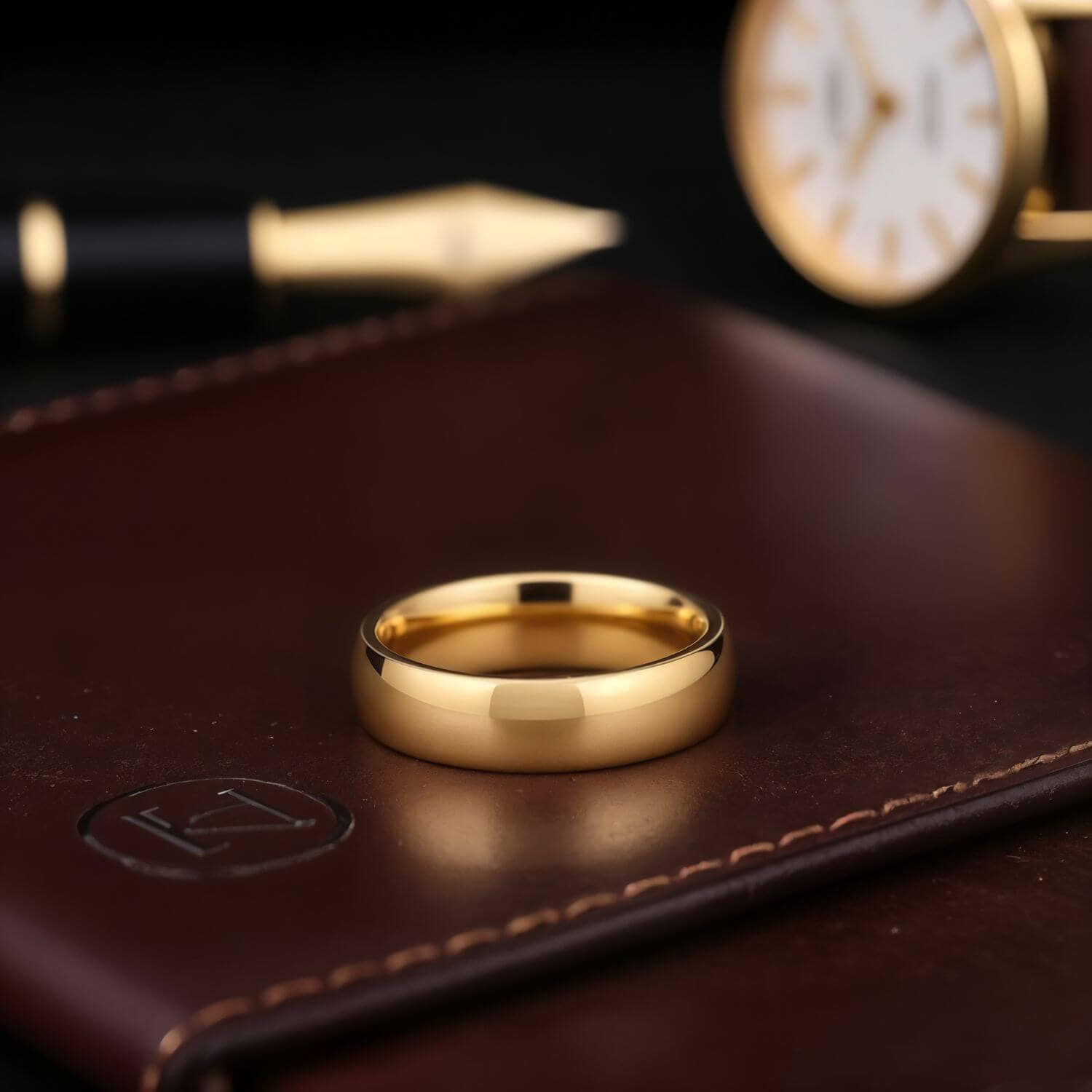 A gold titanium band at 4mm or 6mm. Titanium is roughly half the weight of tungsten, so you genuinely forget you’re wearing it. A men’s wedding ring in gold titanium at a narrow width for buyers who chose gold in a lighter, slimmer ring: engravable, dispatched same day.