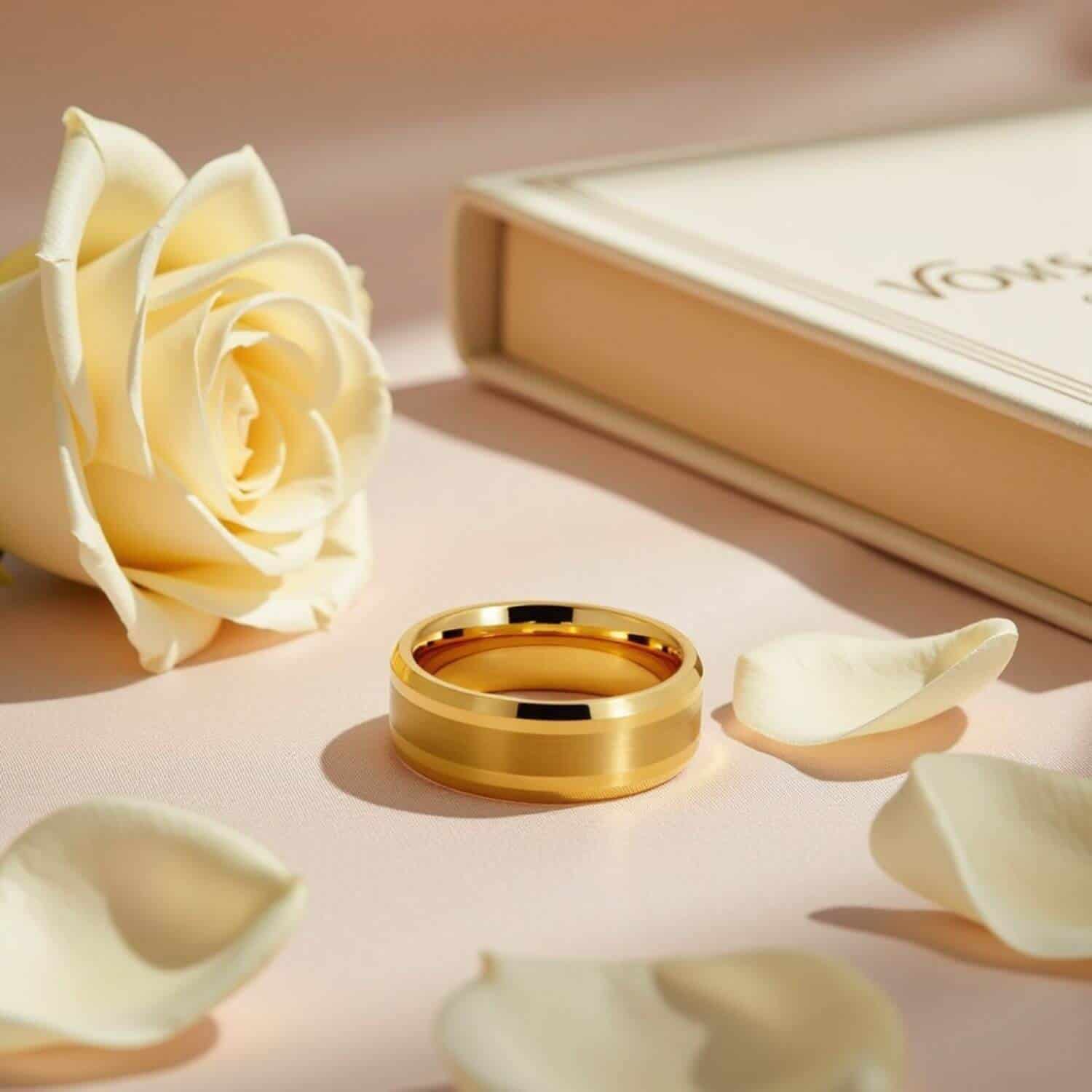 A polished gold tungsten band at 6mm or 8mm. Tungsten carbide is one of the hardest metals used in jewellery: it won’t bend, deform, or tarnish. A men’s wedding ring for buyers who chose gold at both widths: engravable, dispatched same day.
