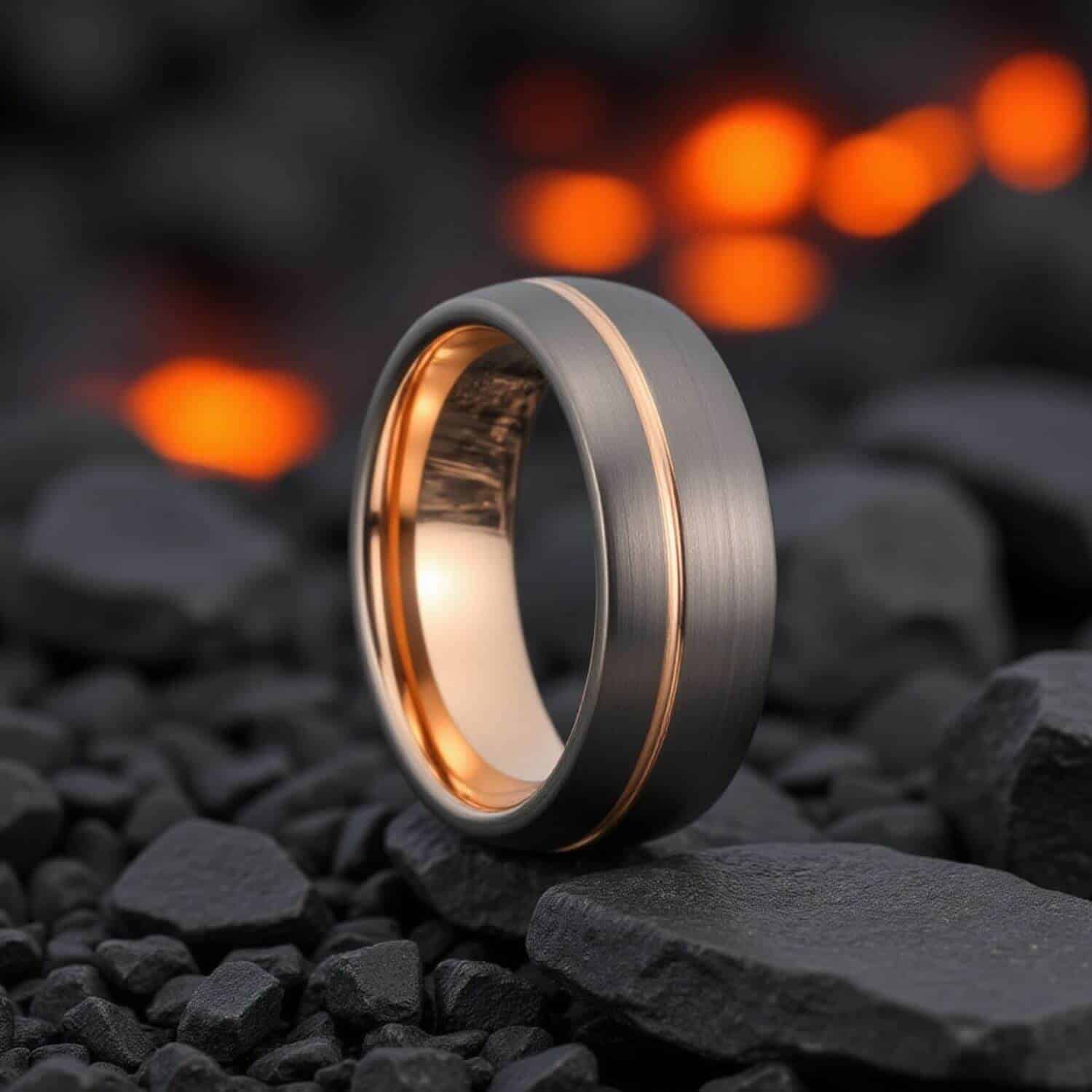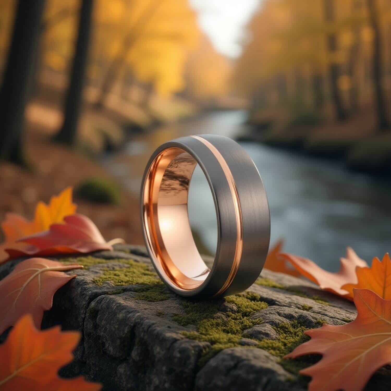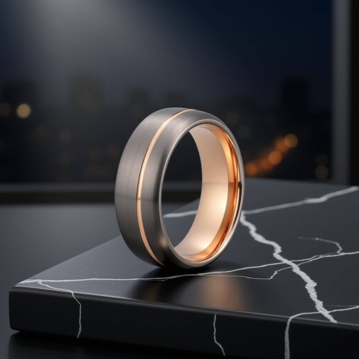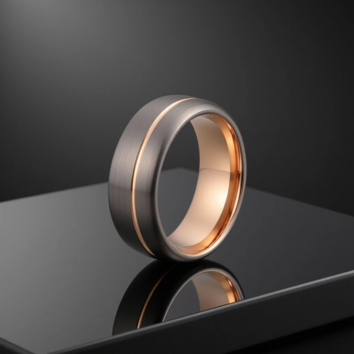 A gunmetal grey tungsten band at 8mm with a rose gold groove inlaid through the surface. Tungsten carbide is one of the hardest metals used in jewellery: it won’t bend, deform, or tarnish. A men’s wedding ring for buyers who chose the specific contrast between gunmetal grey and the warmth of rose gold: engravable, dispatched same day.