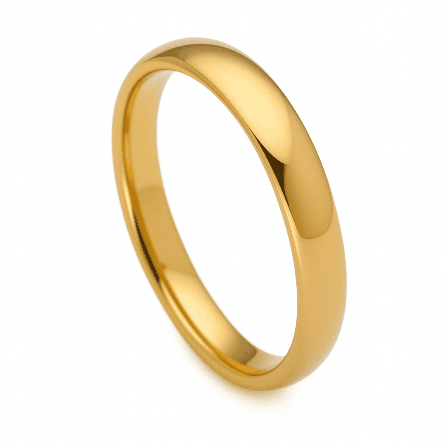 A classic style men’s gold tungsten band. 4mm in width, this is a thin style ring perfect for an understated, elegant, and distinguished look. The polished gold finish enhances its timeless appeal, making it ideal for both formal and everyday wear. Crafted with durable tungsten, this ring is built to last, ensuring it maintains its brilliance over time. Turn your ring into a keepsake with your own unique personalised engraving. Choose a name, special date, or short message to have engraved onto the inside of the ring.