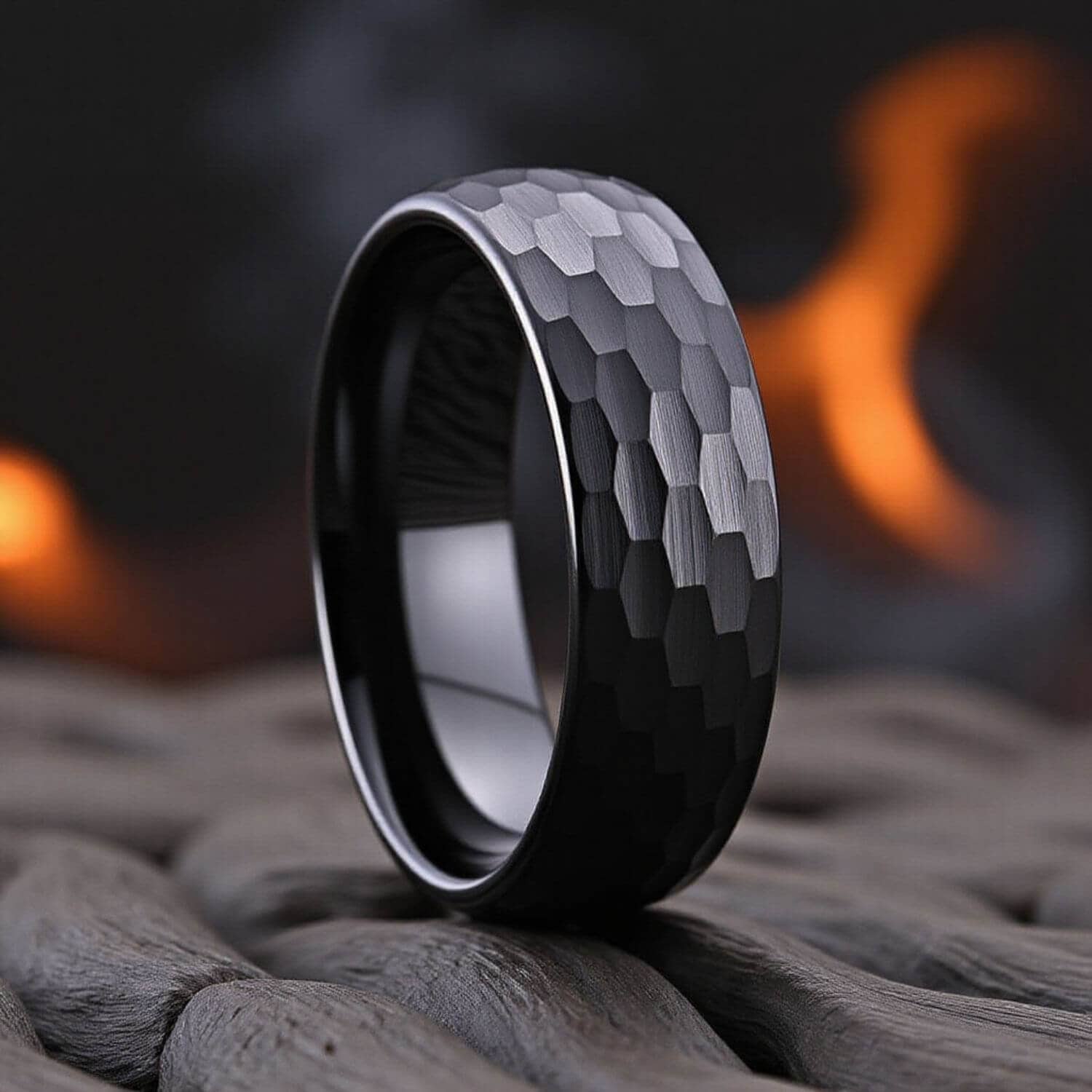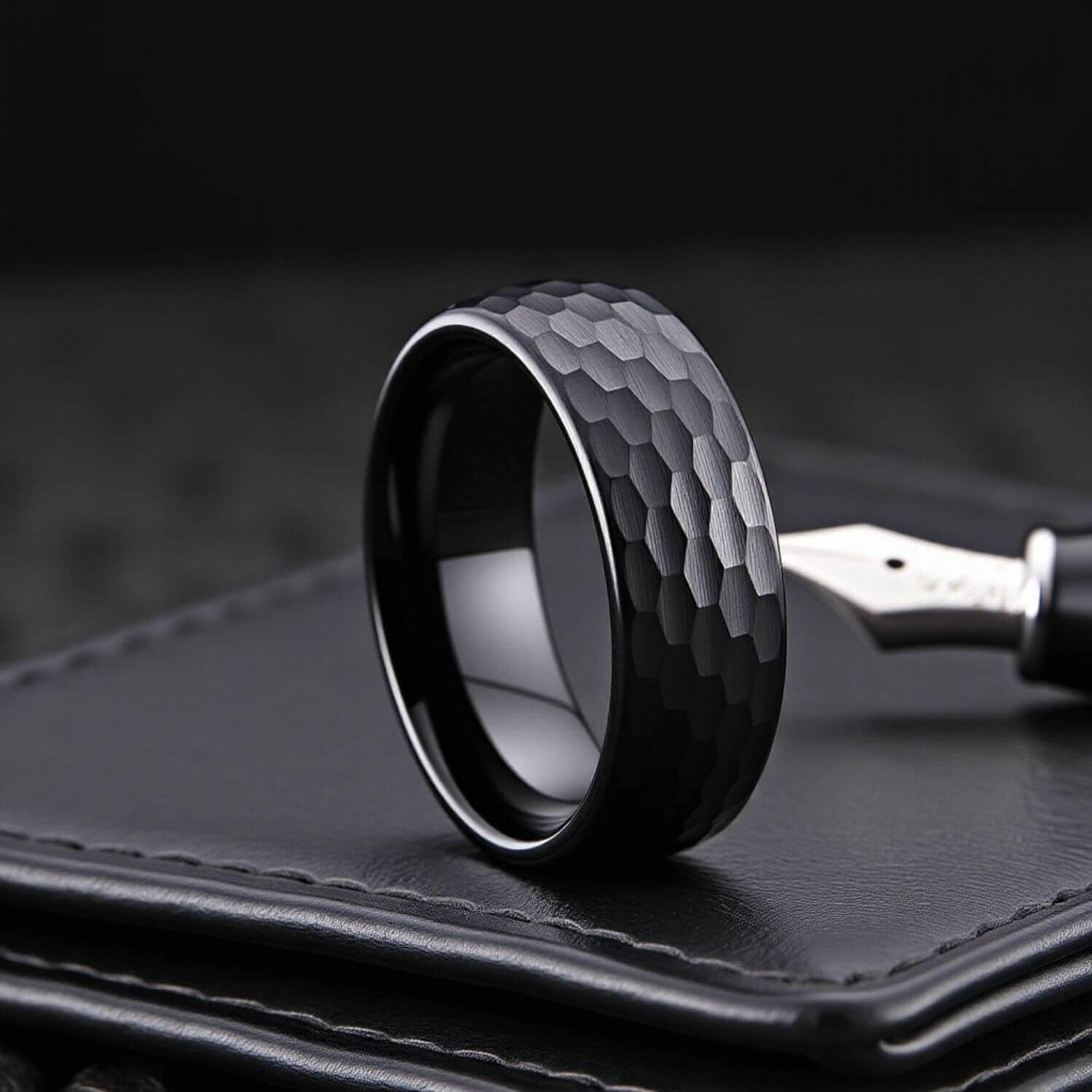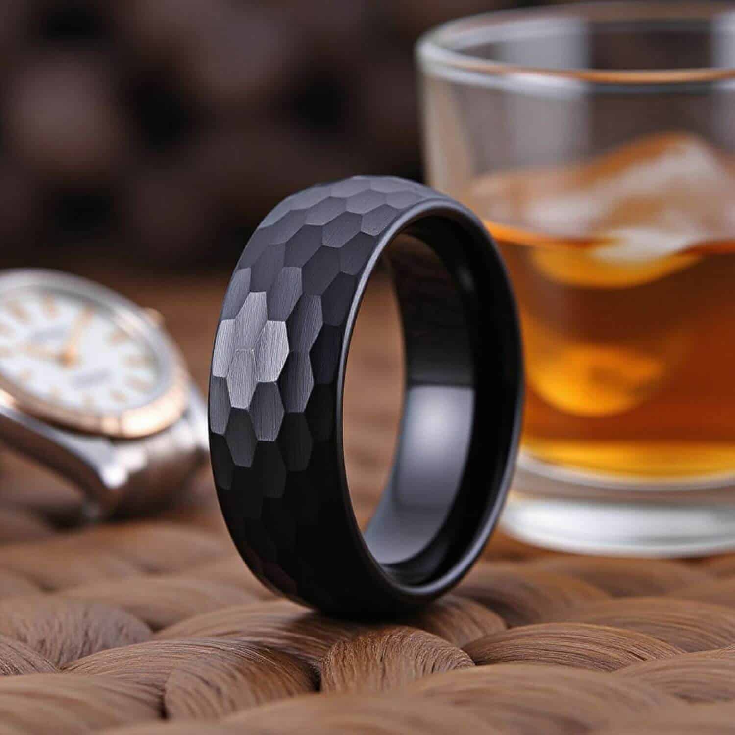 Black PVD on tungsten carbide. Tungsten holds the finish at the contact points where all-black rings on softer base metals dull or chip first.