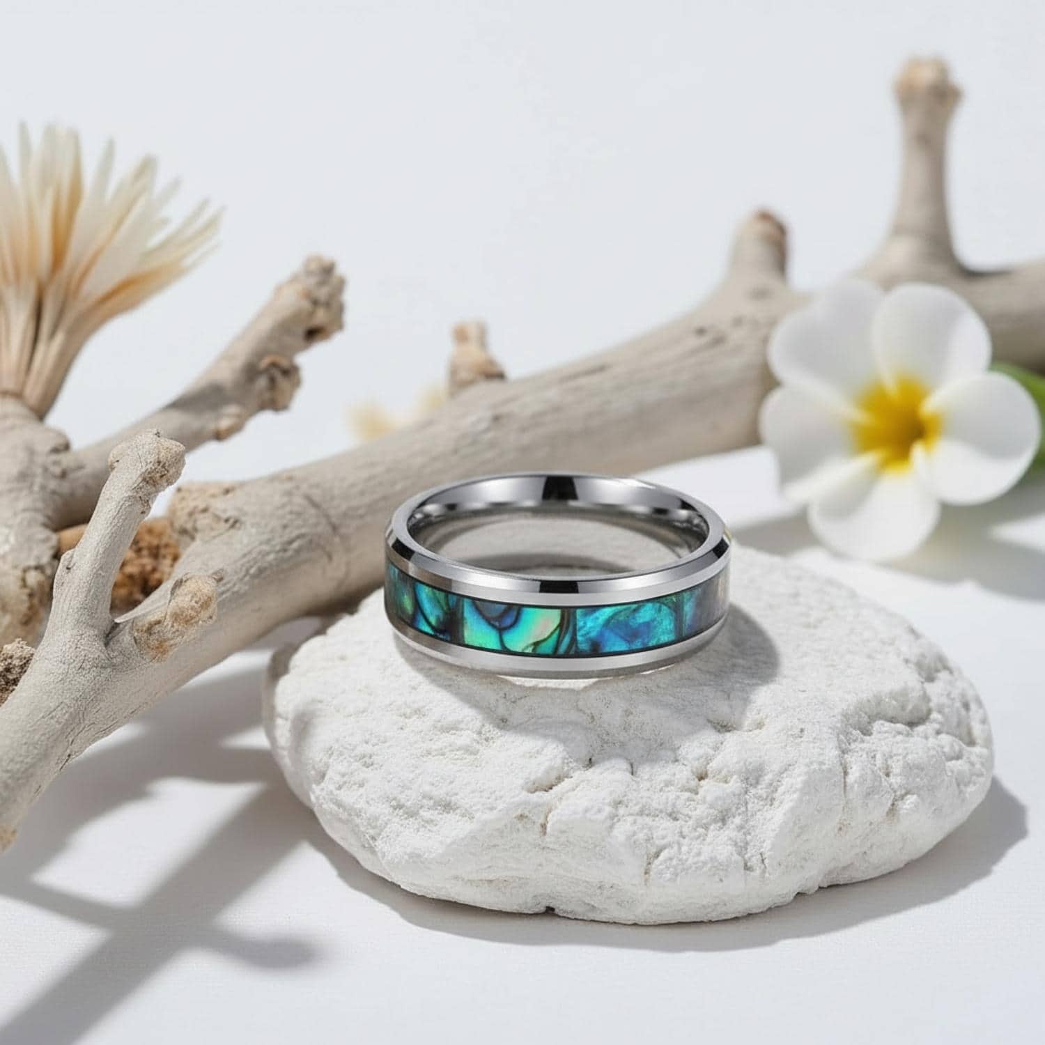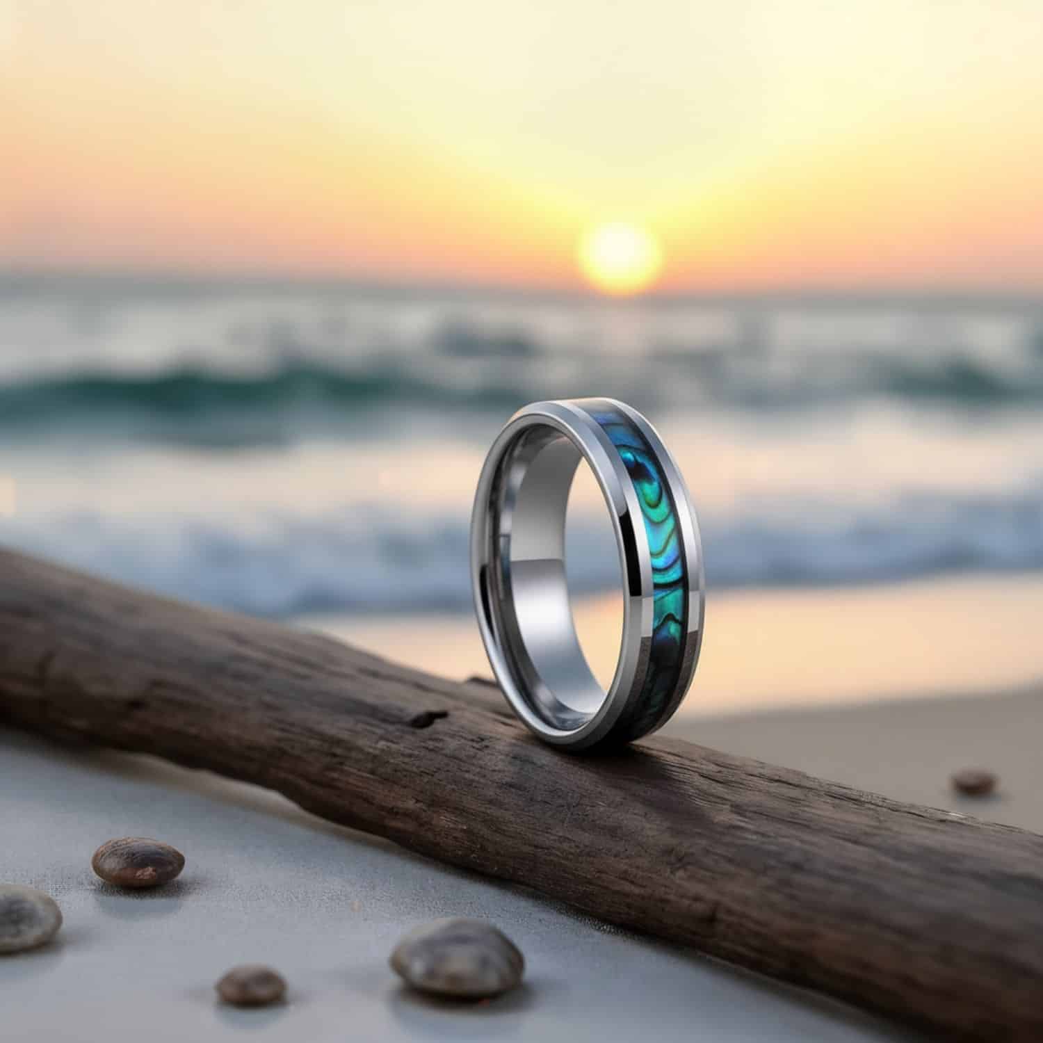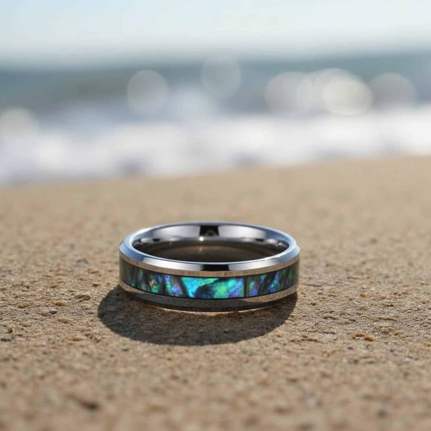 28 buyers of the Shield return to the same observation: the abalone inlay shifts colour depending on the light, reading blue at one angle and green at another. Jake, a UK buyer, bought it as his wedding ring and had the specific concern that online photos often flatter a ring that disappoints in person. His verdict: it arrived looking exactly as pictured, arguably better.