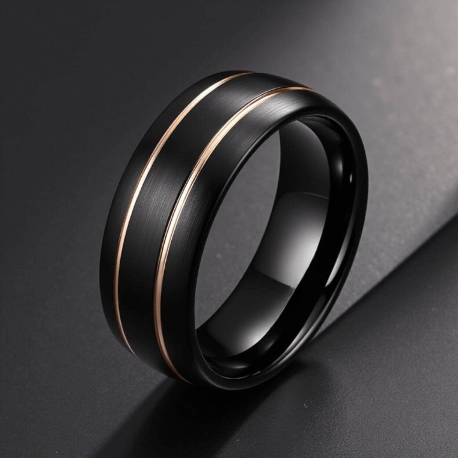 A black tungsten band at 8mm with a polished gold groove inlaid through the surface. Tungsten carbide is one of the hardest metals used in jewellery: it won’t bend, deform, or tarnish. A men’s wedding ring for buyers who chose black and gold and wanted a ring where the contrast reads as a deliberate design decision: engravable, dispatched same day.
