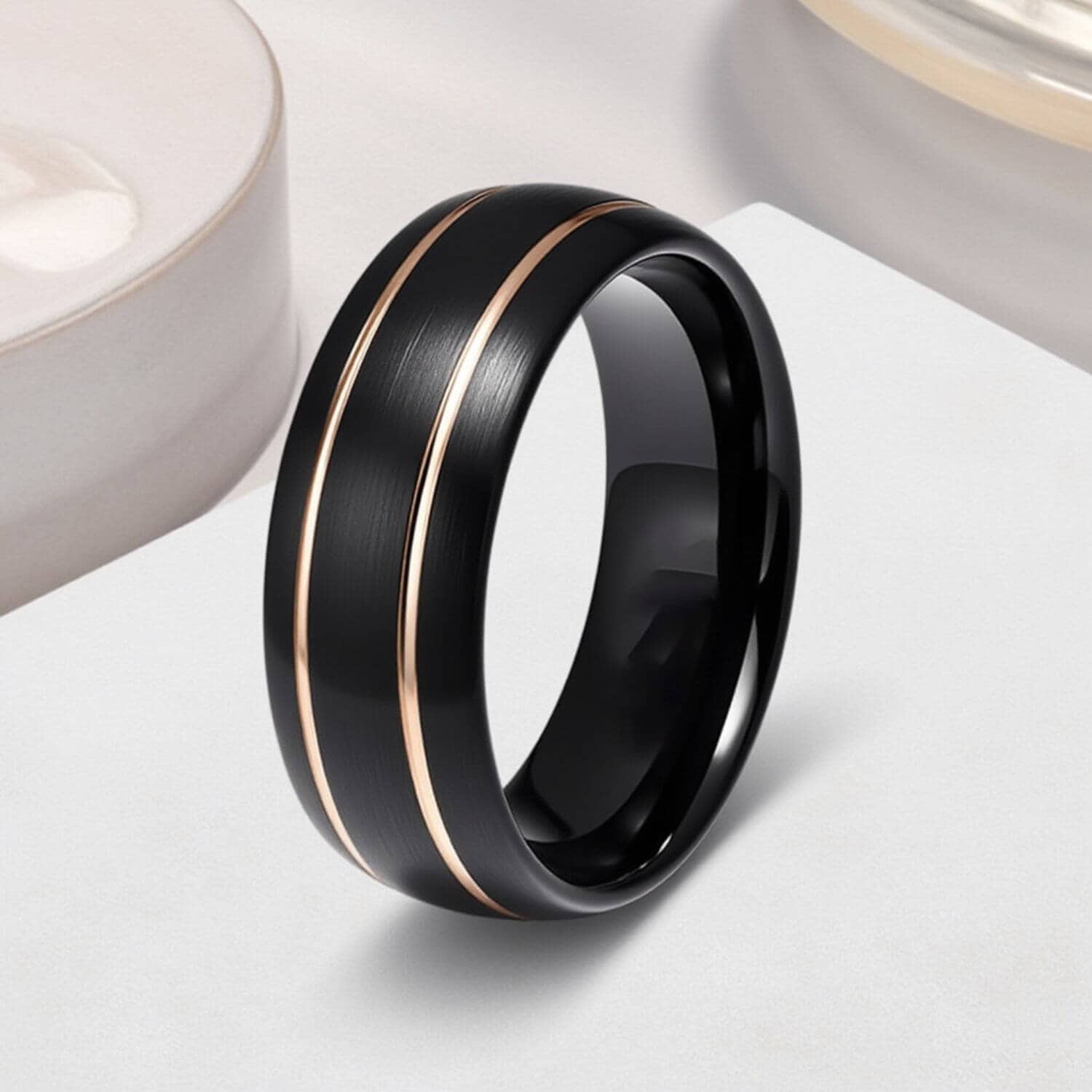 Black and gold PVD on tungsten carbide. Both finishes hold through daily wear.