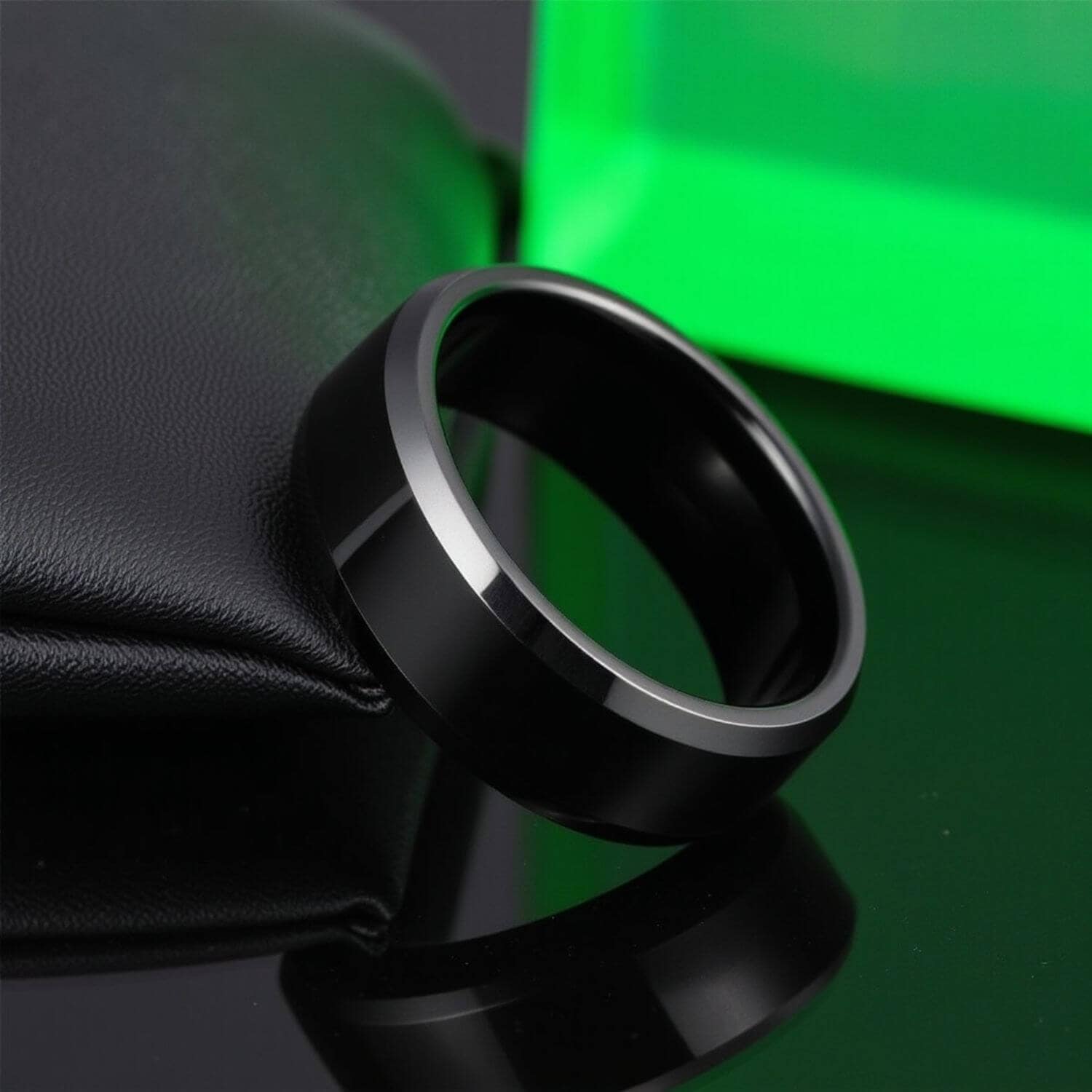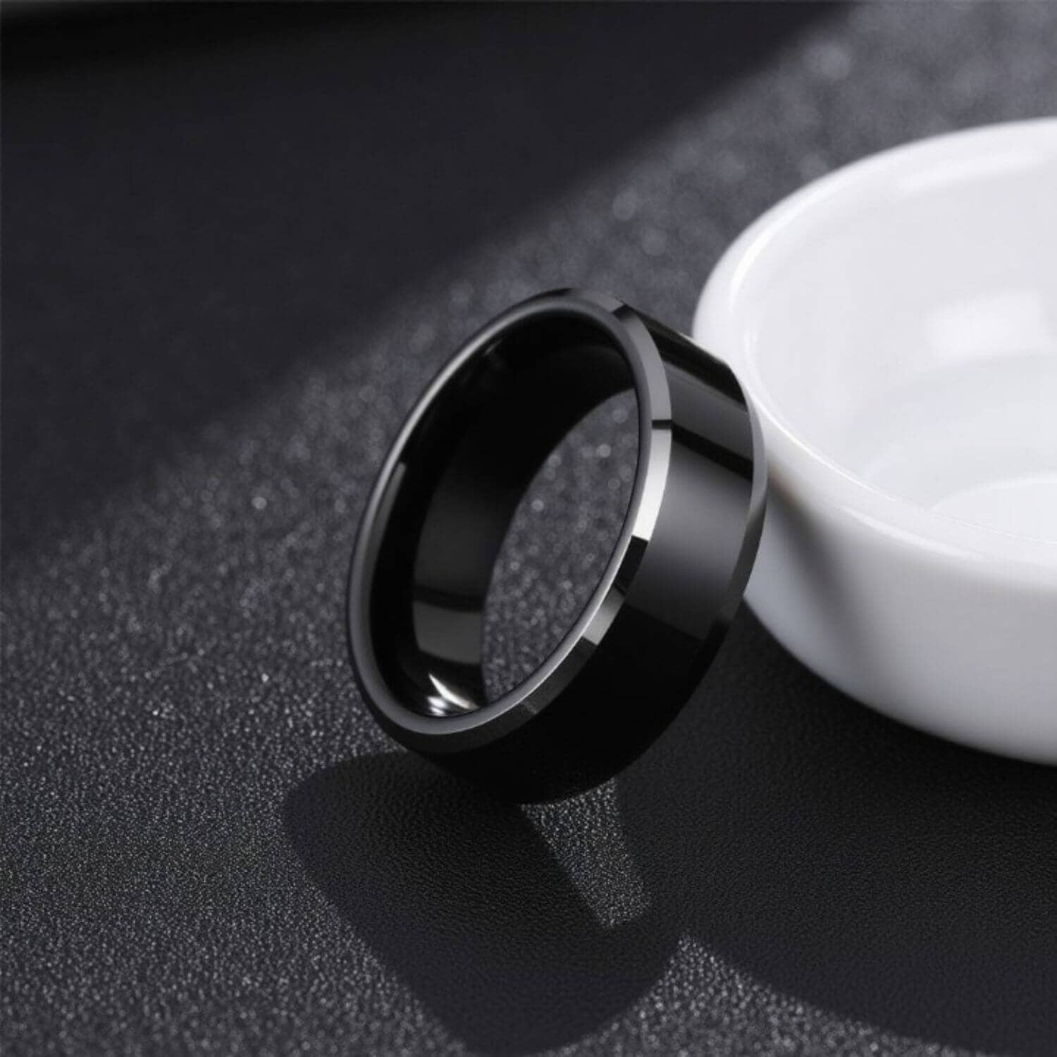 Tungsten carbide sits at 9 on the Mohs hardness scale — one below diamond. The black PVD finish is bonded at a molecular level, not plated on top. Graham Lucas bought the 8mm specifically as a work wedding ring because of tungsten’s durability: “It looks classy and manly. It will be used as a work wedding ring because of the durability of tungsten. Very happy.”