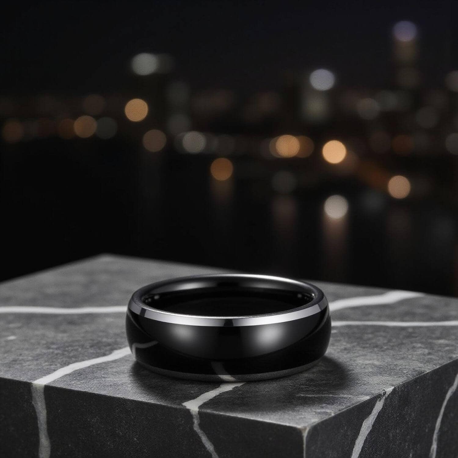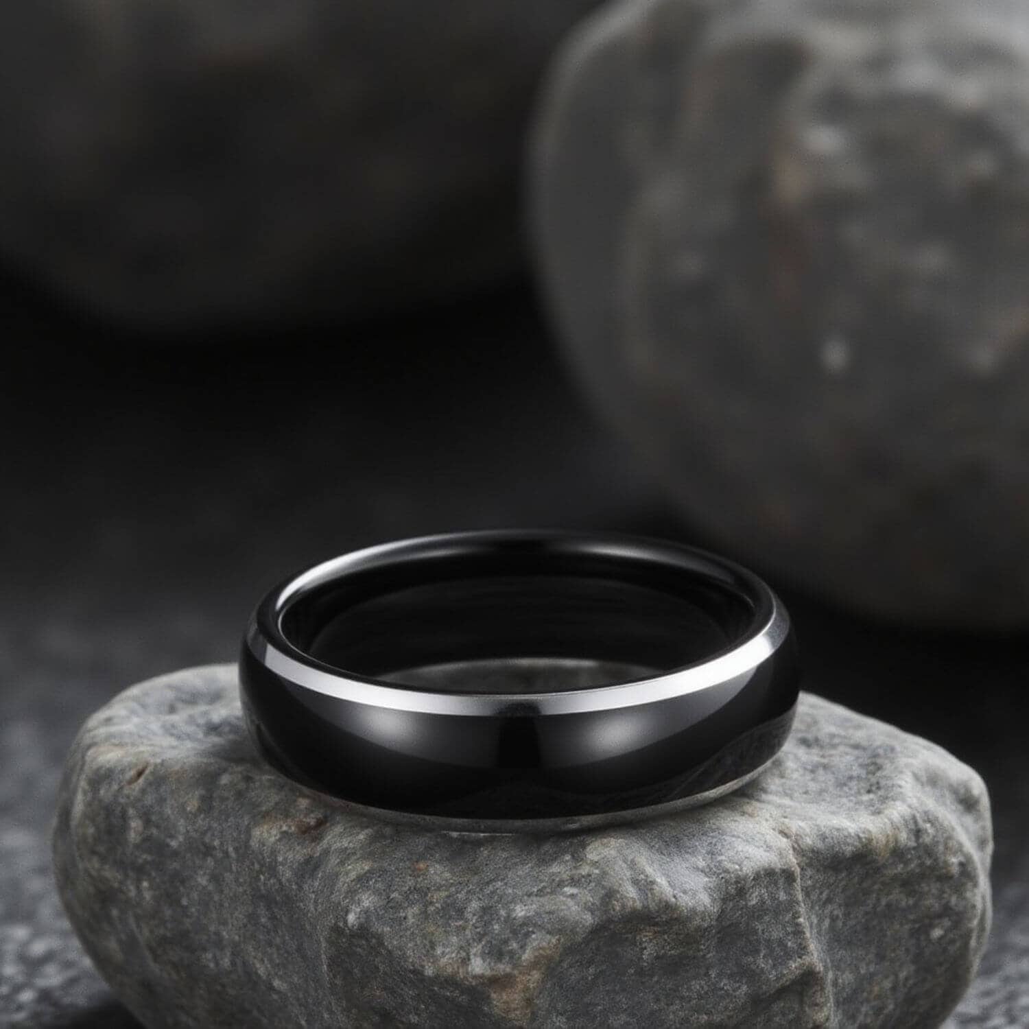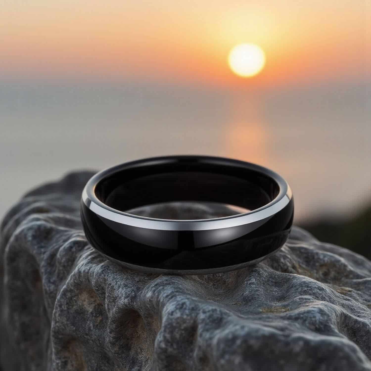 A black tungsten band at 6mm or 8mm with a polished silver stripe set into the centre, running cleanly around the full circumference. Tungsten carbide is one of the hardest metals used in jewellery: it won’t bend, deform, or tarnish. A men’s wedding ring for the buyer who wanted something between a plain band and a two-tone finish, where the detail is precise rather than decorative: engravable, dispatched same day.