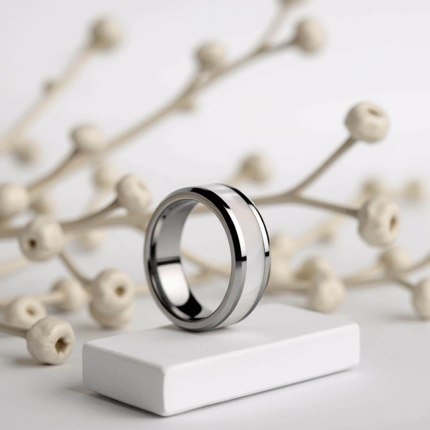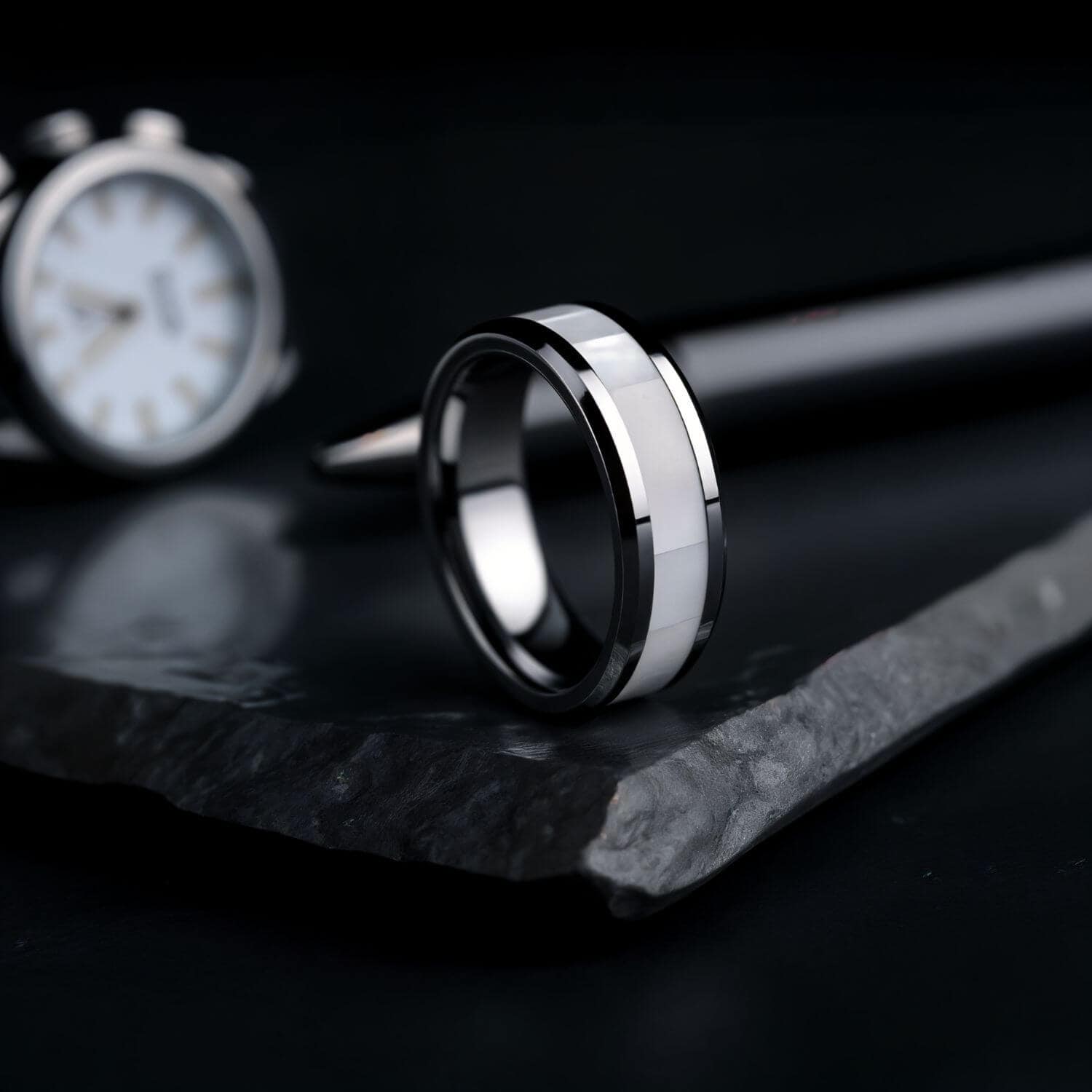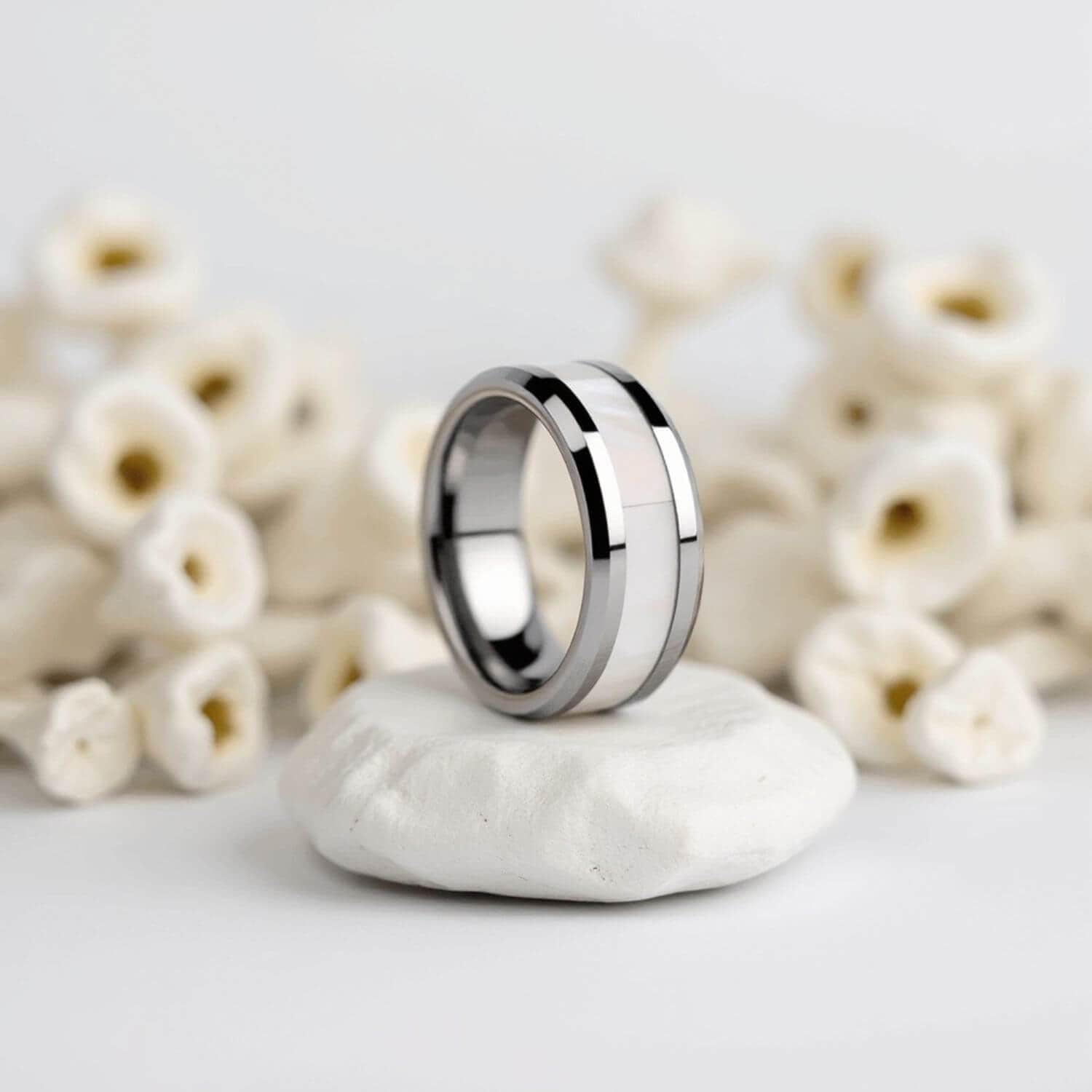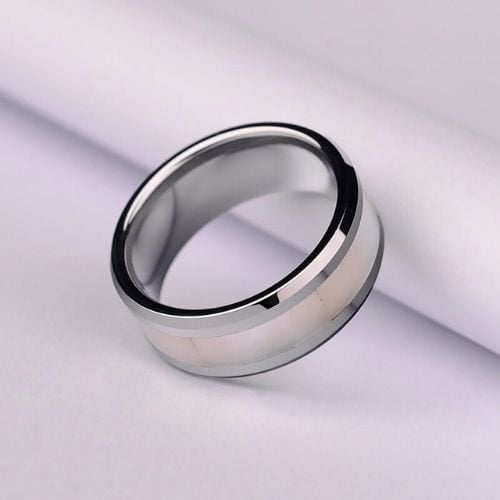 mother of pearl mens ring with silver rims tungsten 8mm wedding anniversary engagement band in all sizes