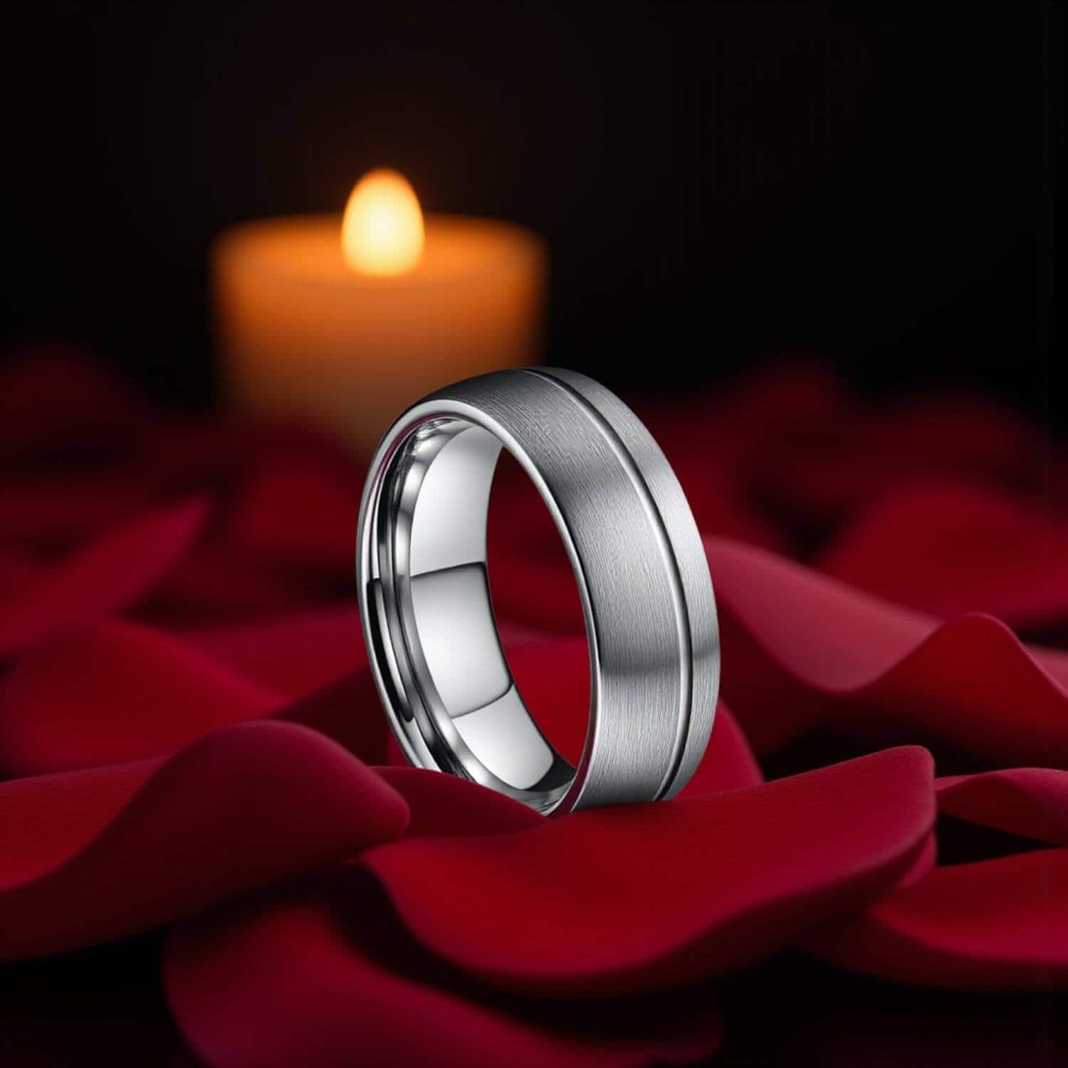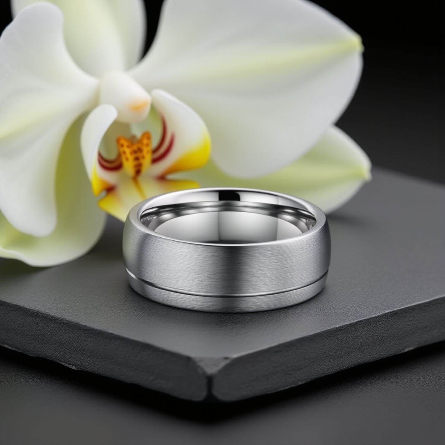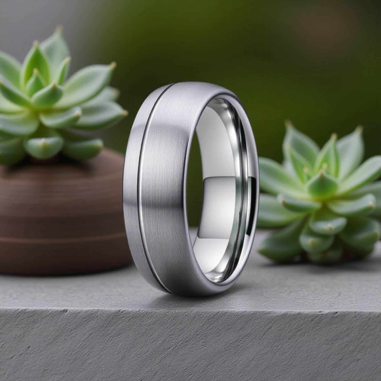 The polished silver finish on the Aspen holds through daily wear because the tungsten carbide base is hard enough to resist the contact marks that appear on softer metal bands at the highest wear points.