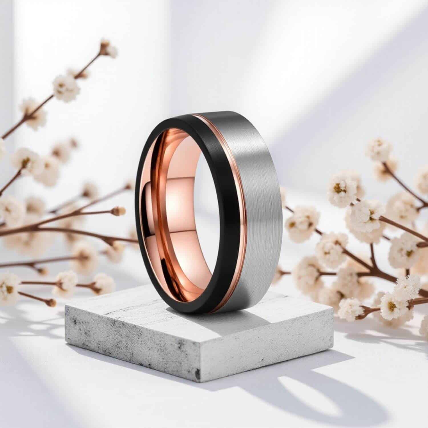 A polished silver tungsten band at 8mm with a black groove inlaid through the surface. Tungsten carbide is one of the hardest metals used in jewellery: it won’t bend, deform, or tarnish. A men’s wedding ring for buyers who chose silver with a precise black detail: 6 reviews confirm the contrast holds: engravable, dispatched same day.