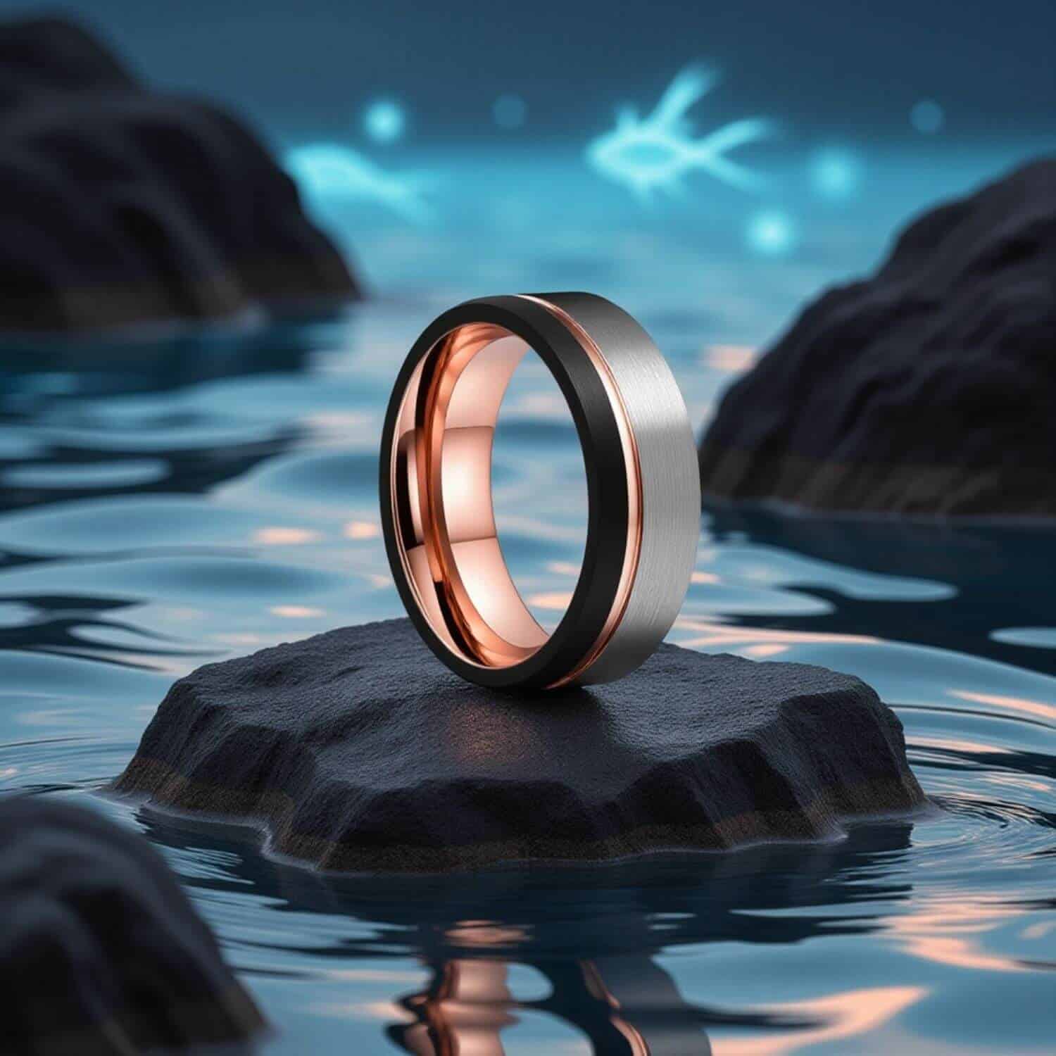 Silver and black PVD on tungsten carbide. Tungsten holds both at the groove boundary through daily wear.