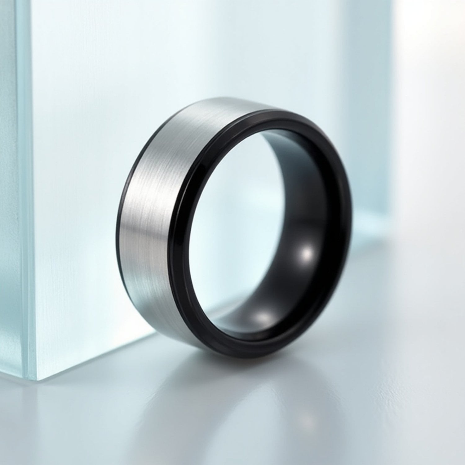 The silver centre framed by the sleek black border is a subtle contrast. It’s a ring for him that blends into your look seamlessly, regardless of your outfit or the occasion you are attending. Suitable as a men’s wedding band, engagement ring, a gent’s band to wear everyday, or for special occasions.