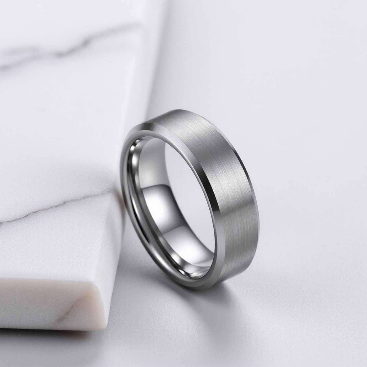 The Lucid is a timeless mens tungsten wedding ring with a clean, understated look. Featuring a silver matte brushed surface, polished bevelled edges, and a polished silver interior, it balances subtle style with modern sophistication. This simple yet striking gentโs band is designed for men who appreciate clarity and refinement in their jewellery.