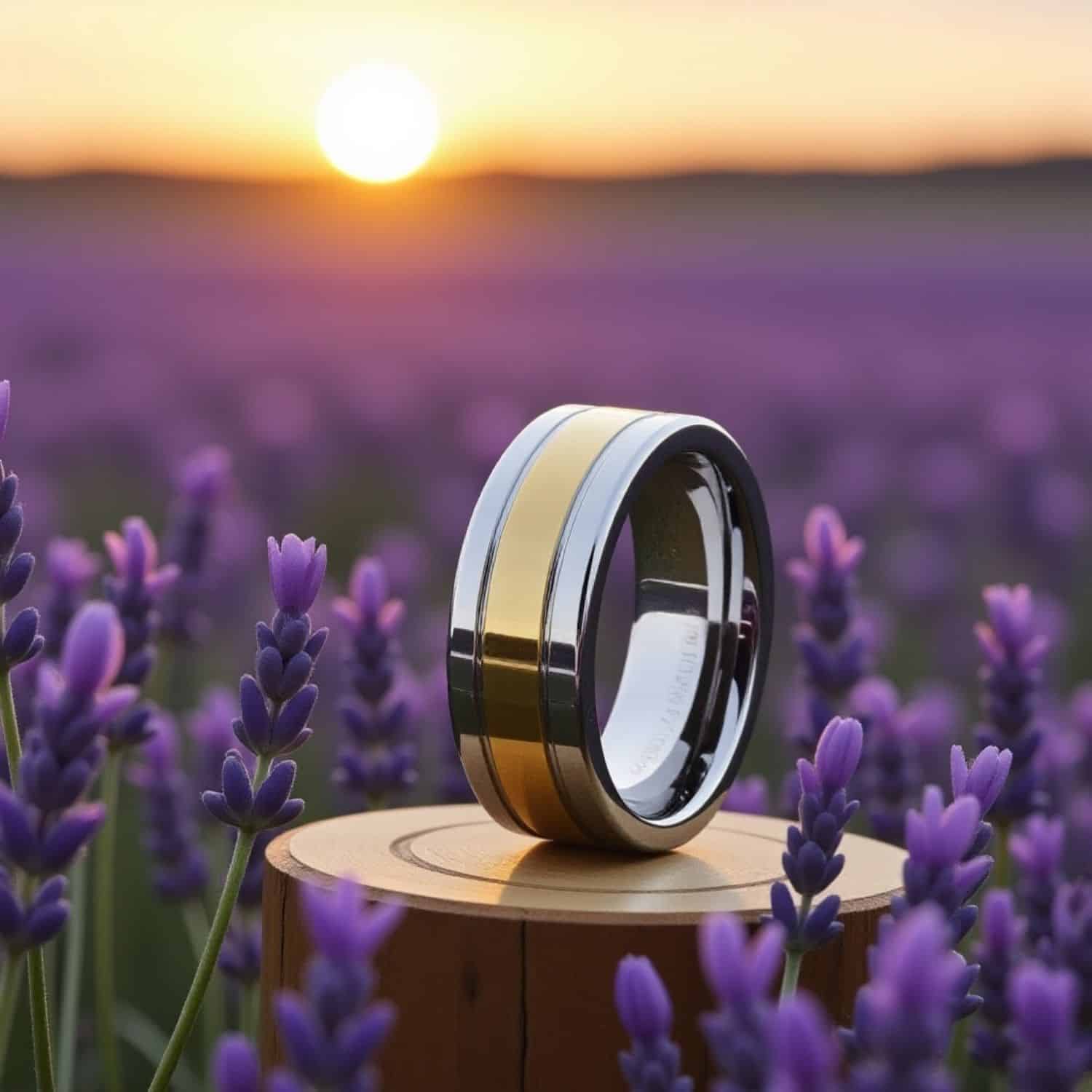 The Opulent is a flat-profile mens tungsten wedding ring that blends polished silver with gleaming yellow gold. This two-tone male band has a refined yet weighty feel, offering both durability and elegance. Its bold contrast of colours makes it a standout choice for men who want a ring that reflects both strength and style.