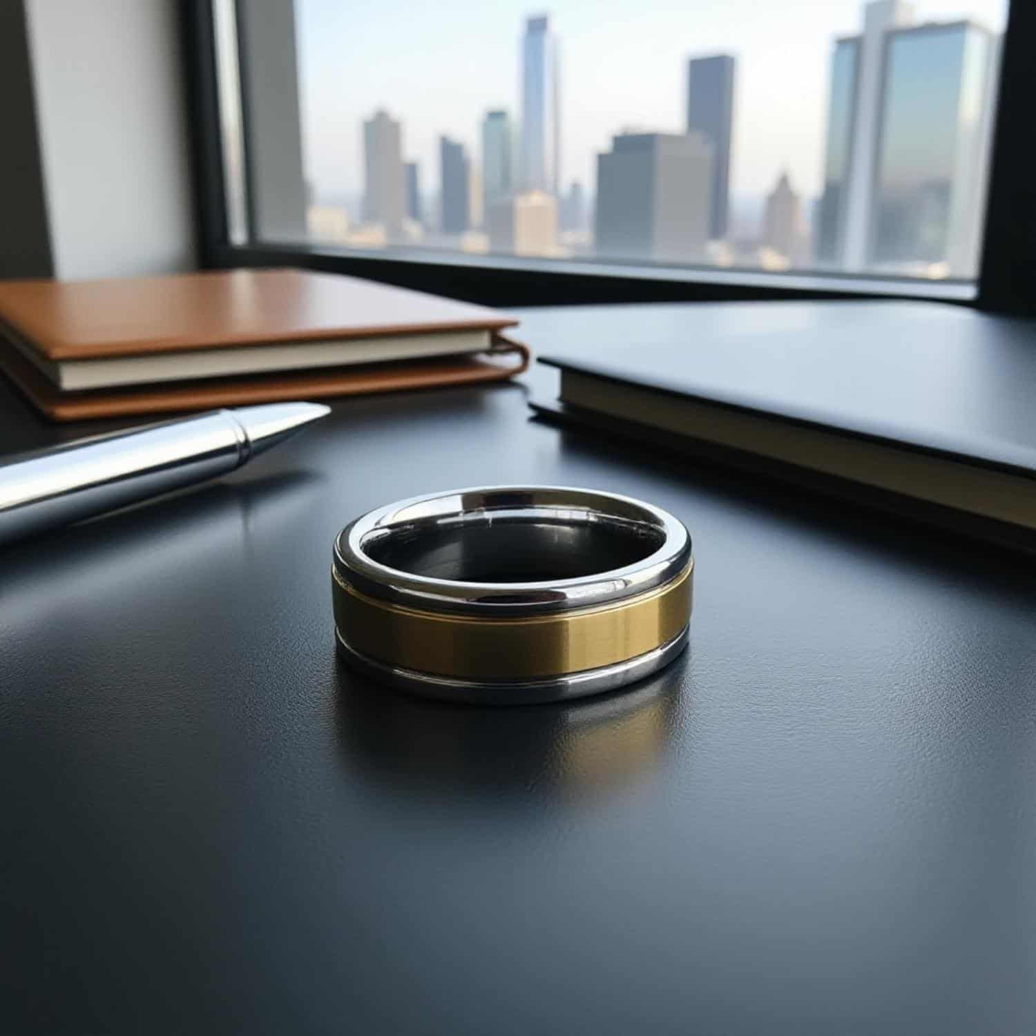 - Polished silver edges โ elegant contrast that completes this two-tone male band