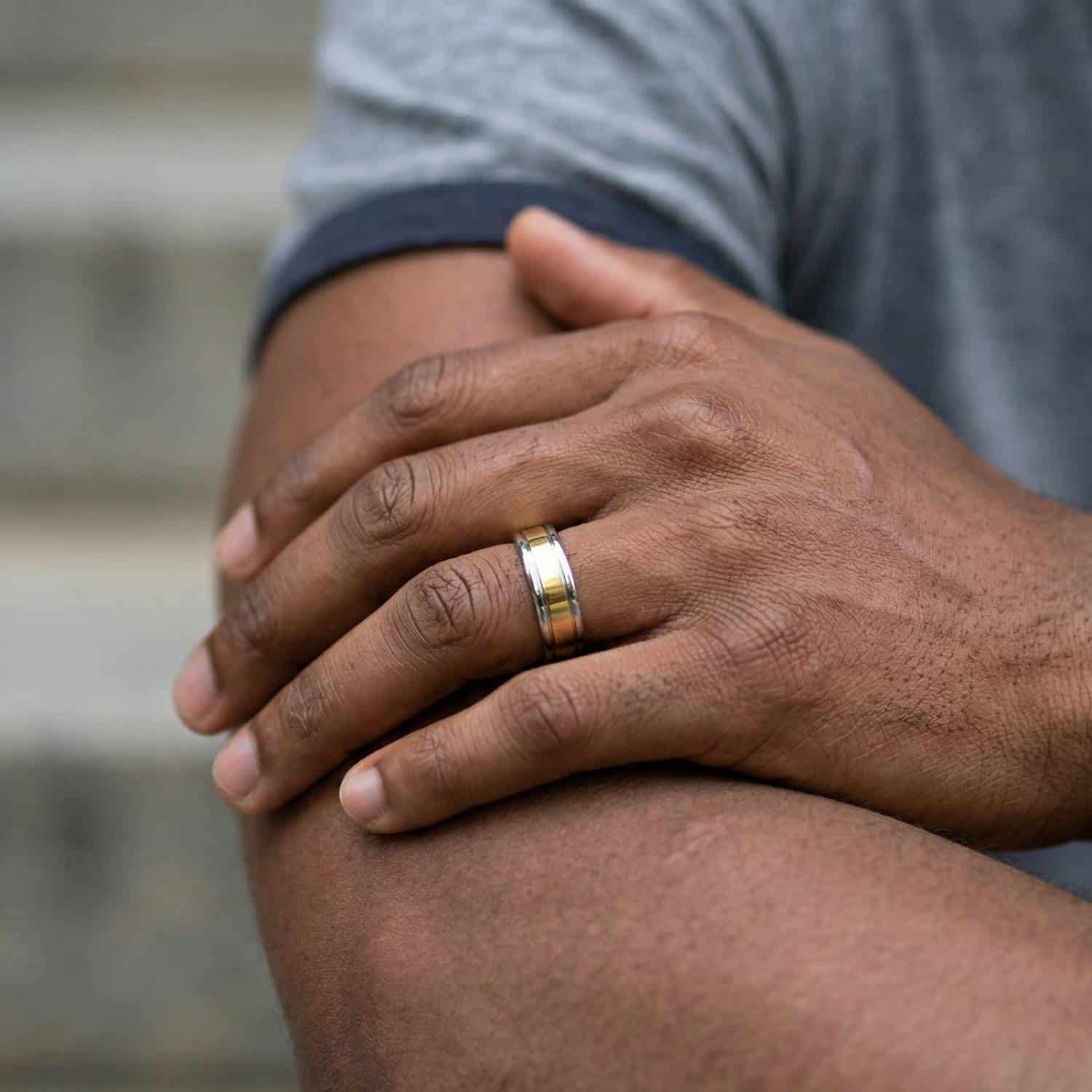 Newman Bands has shipped silver and gold tungsten rings across the range and the consistent pattern from buyers is that the two-tone combination reads as a considered choice in person rather than simply decoration. The question buyers have with a silver and gold ring is whether the boundary between the two tones looks precise or soft. On the Opulent the boundary is clean and holds its definition.