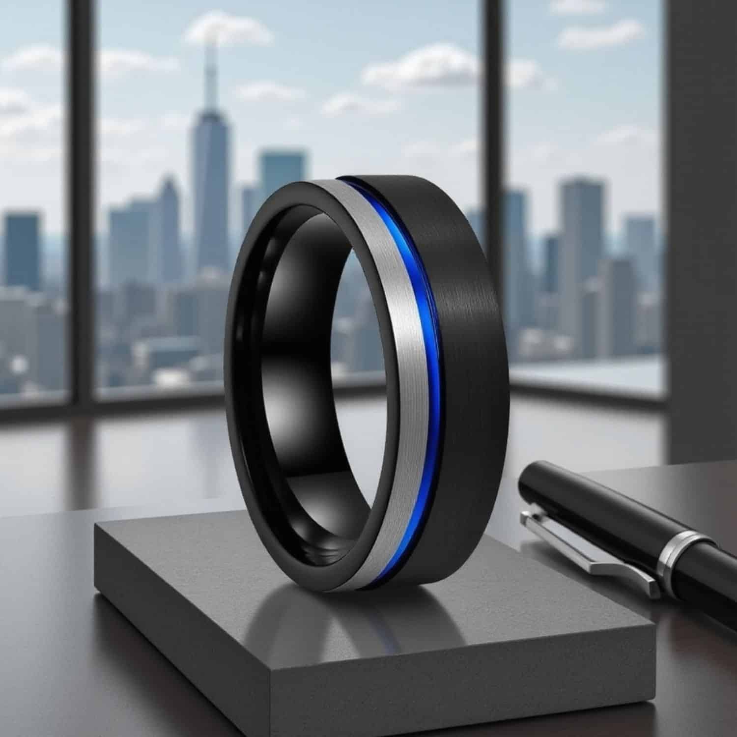 The Paramount is a bold mens tungsten ring that combines brushed black and brushed silver with a striking groove of polished blue. Strong, stylish, and full of presence, this versatile mens band works beautifully as a mens wedding ring, engagement ring, eternity ring or promise band, while also making a memorable gift for him. Engraving and personalisation are available, so you can mark it with a message that matters.