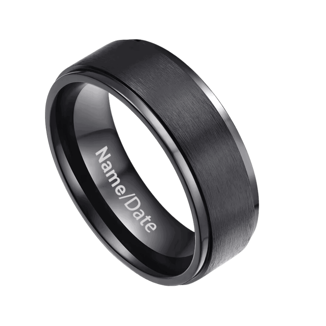 Engraving is laser engraved. It is noticeable in wider rings (8mm) and present in thinner styles (4mm) — the depth is consistent with the material. Most buyers note it reads clearly in person.