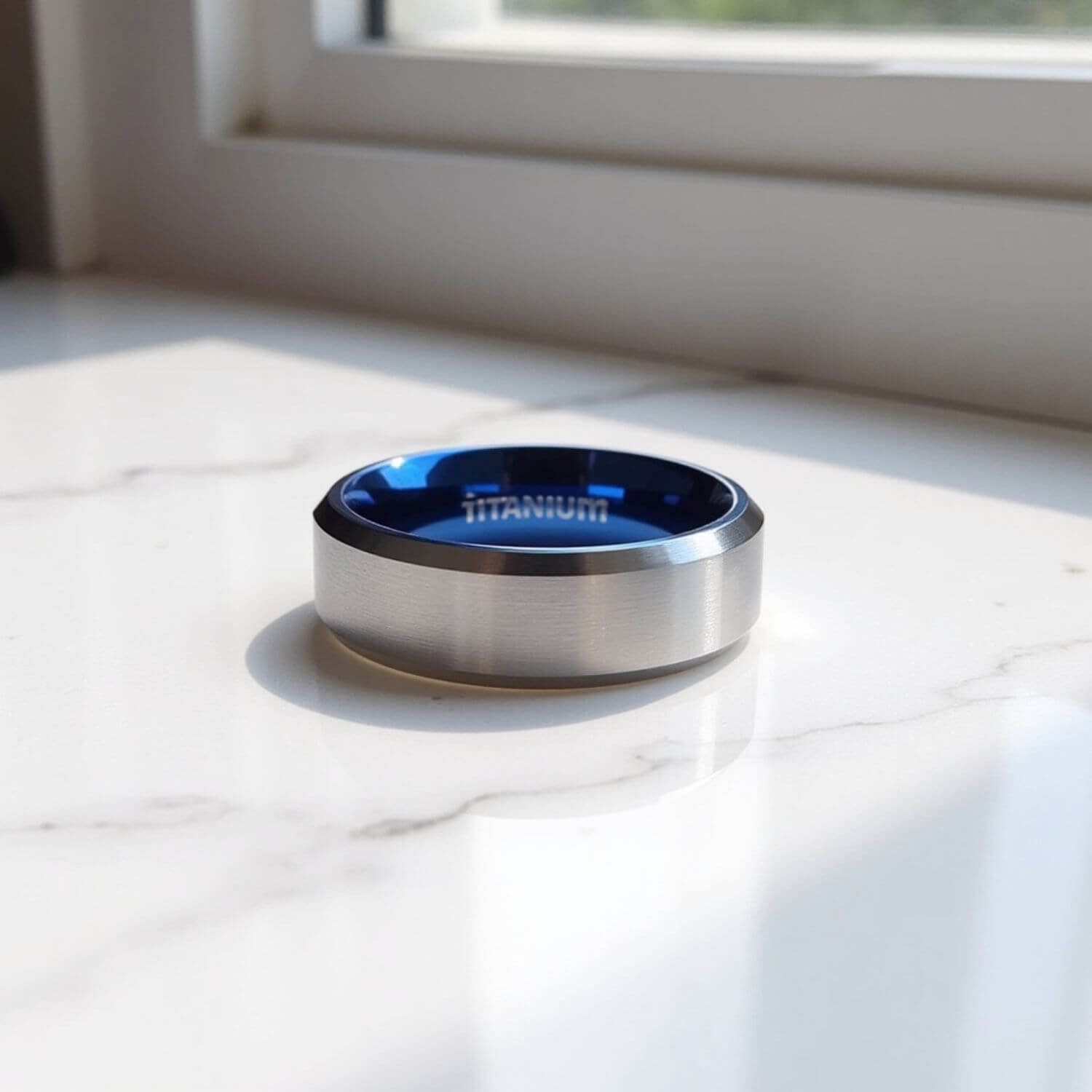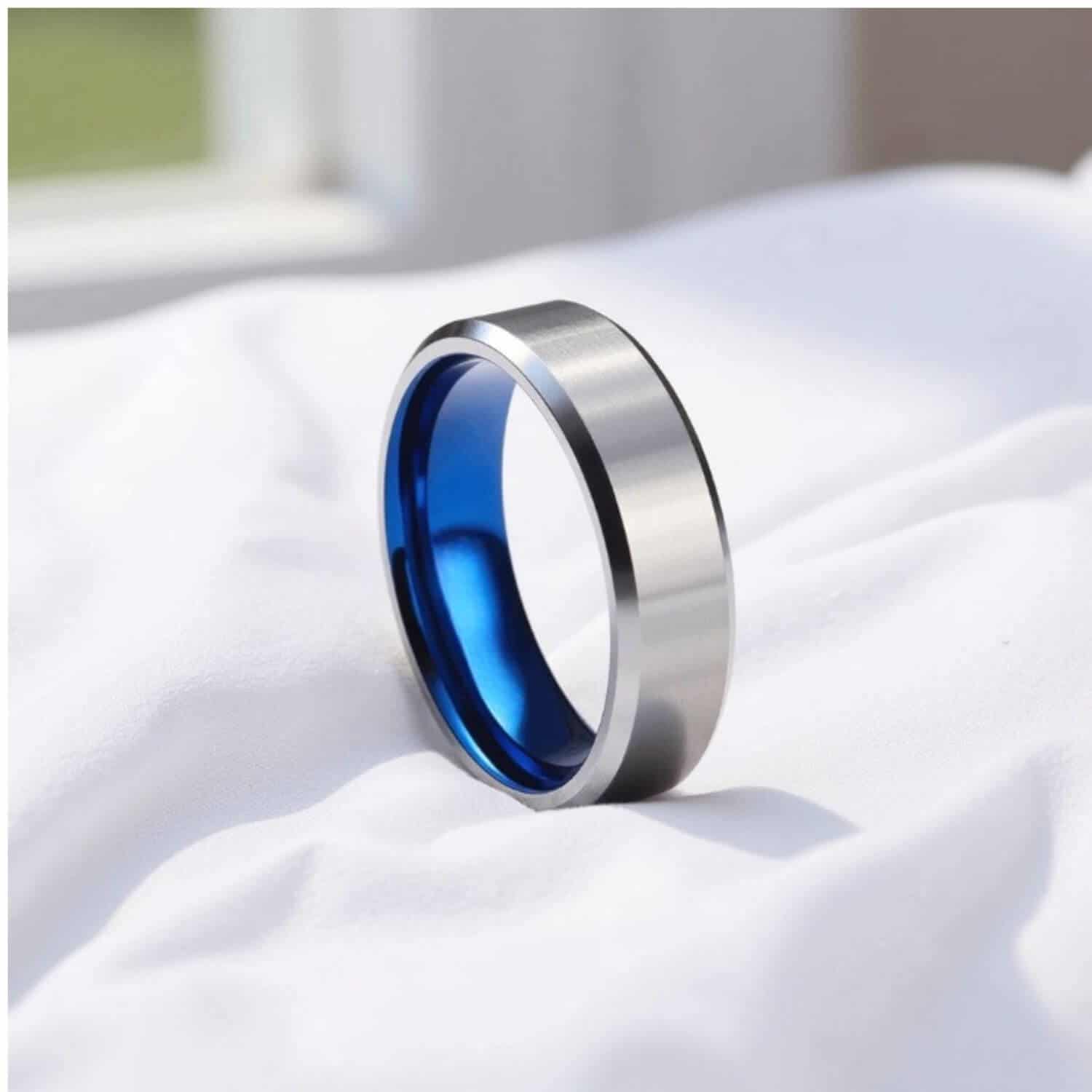 The Primo is a sleek mens titanium ring that blends a matte silver centre with polished silver bevelled edges and a vibrant polished blue interior. Lightweight yet durable, this versatile mens band is perfect as a mens wedding ring, engagement ring, eternity ring or anniversary band, while also making a meaningful gift that can be worn every day or on special occasions. Engraving and personalisation are available, adding a touch of individuality to this modern classic.