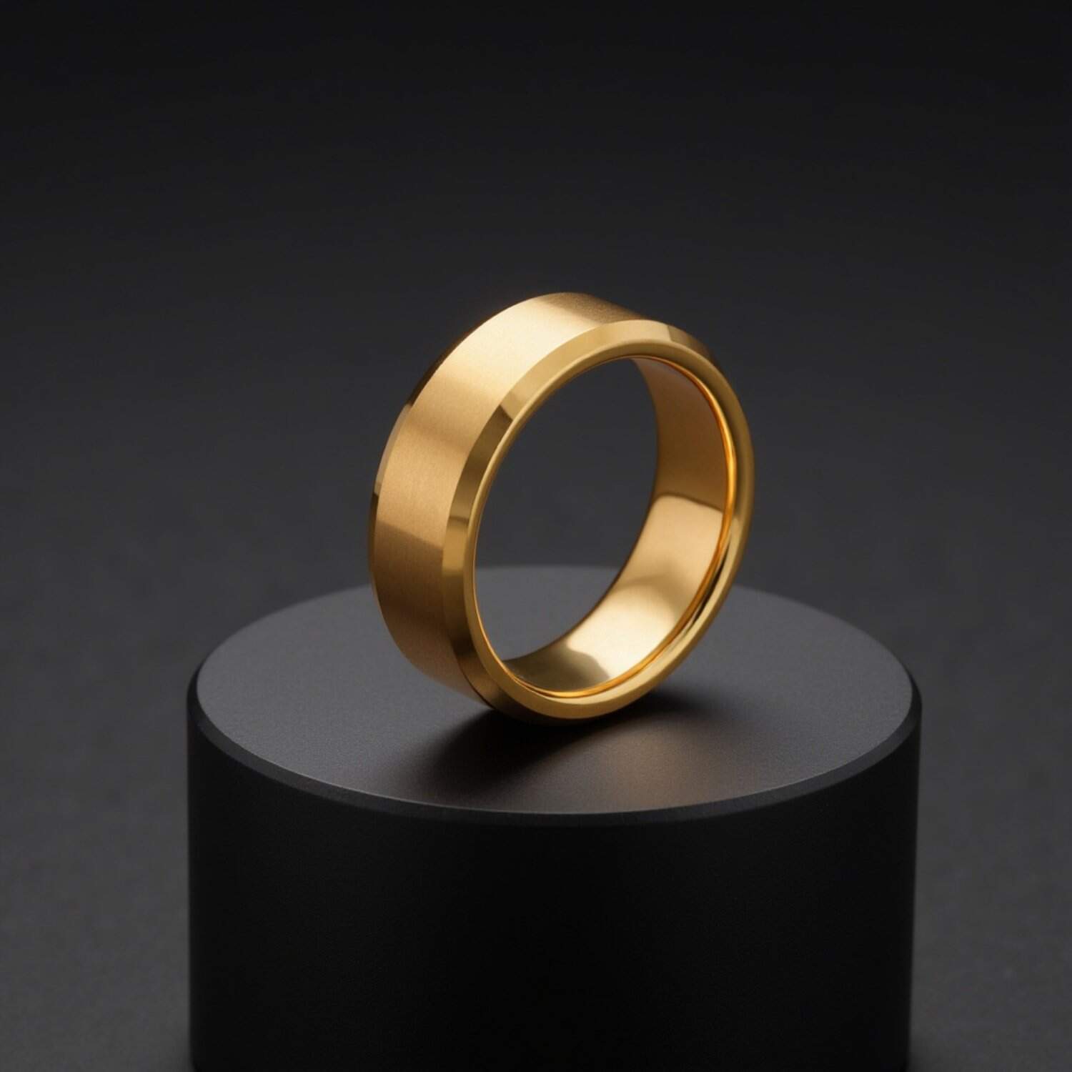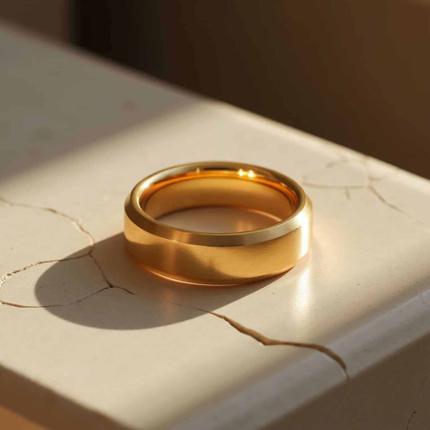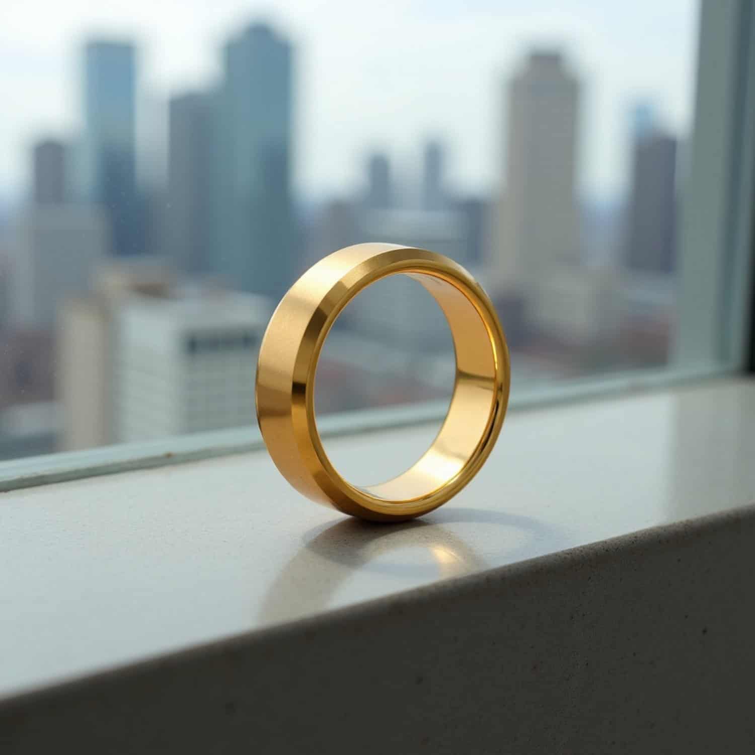 Gold PVD on tungsten carbide. The finish holds through daily wear.