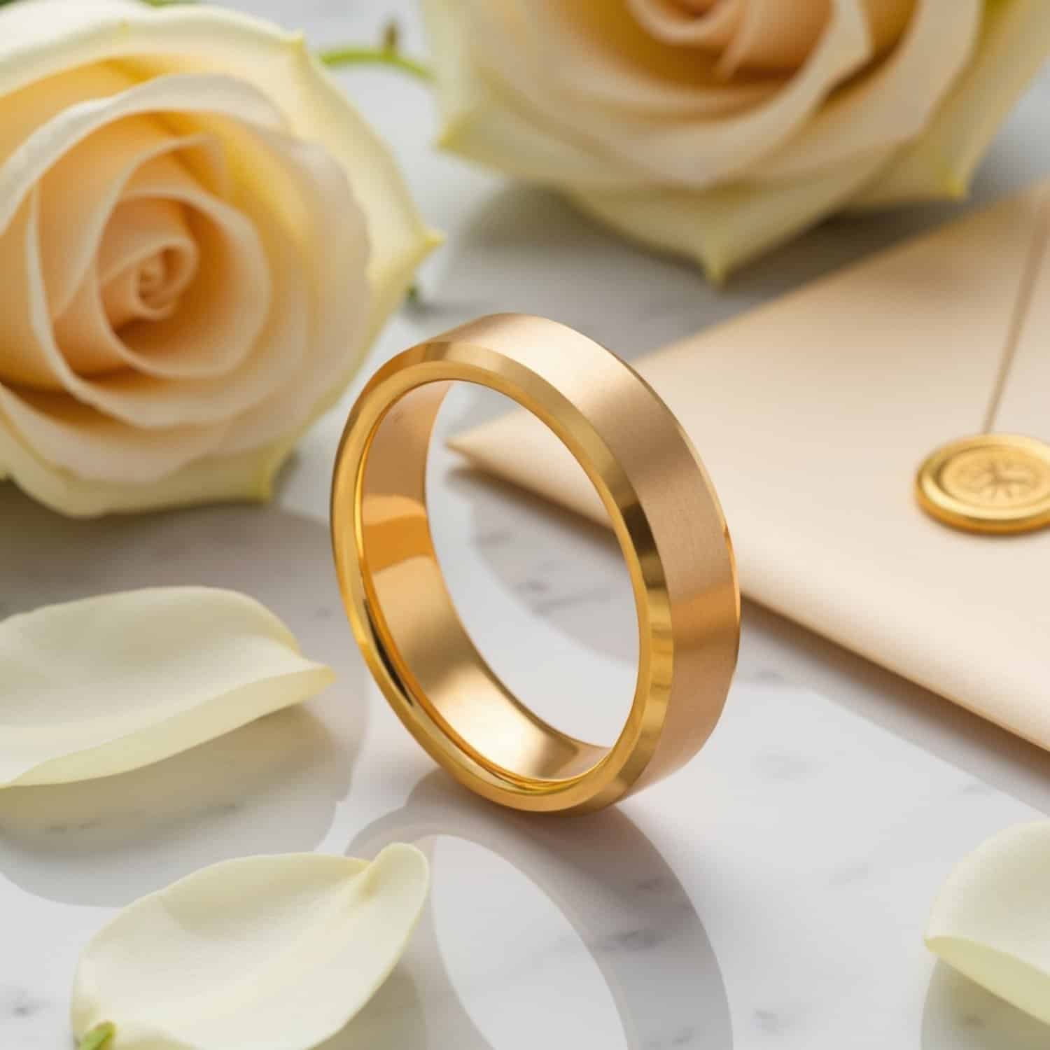 A polished gold tungsten band at 6mm or 8mm. Tungsten carbide is one of the hardest metals used in jewellery: it won’t bend, deform, or tarnish. A men’s wedding ring for buyers who chose gold: 3 reviews confirm the finish holds: engravable, dispatched same day.