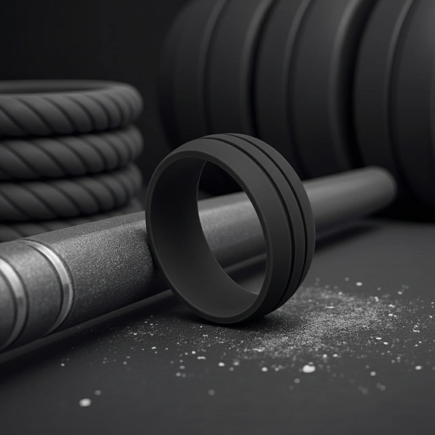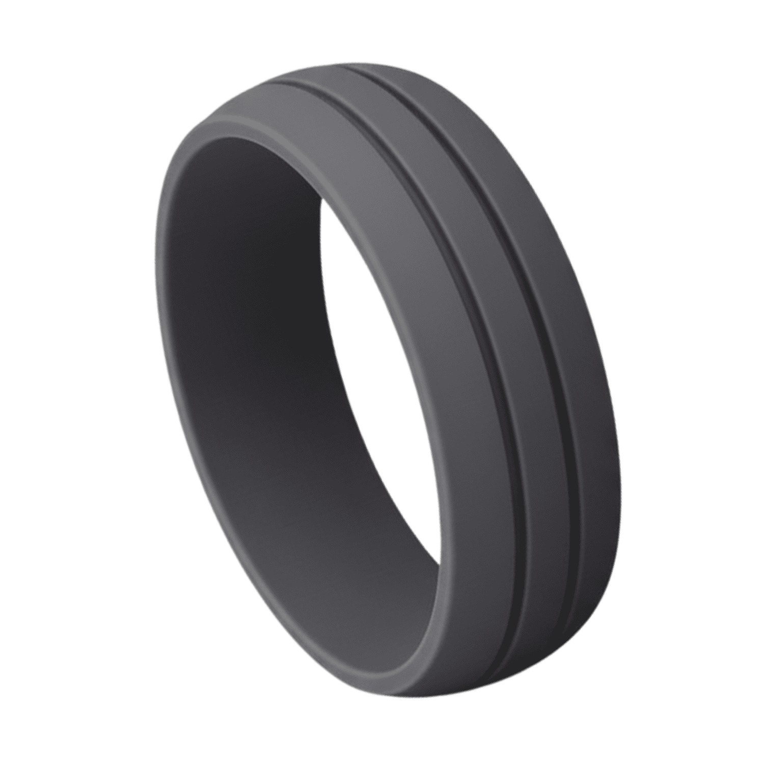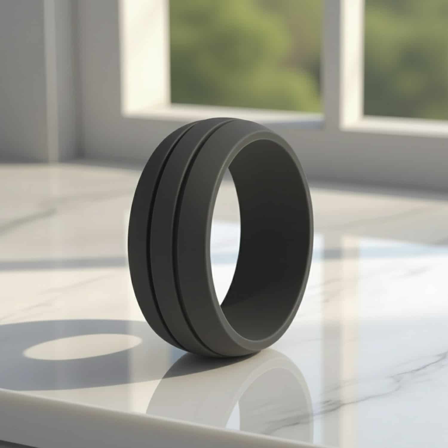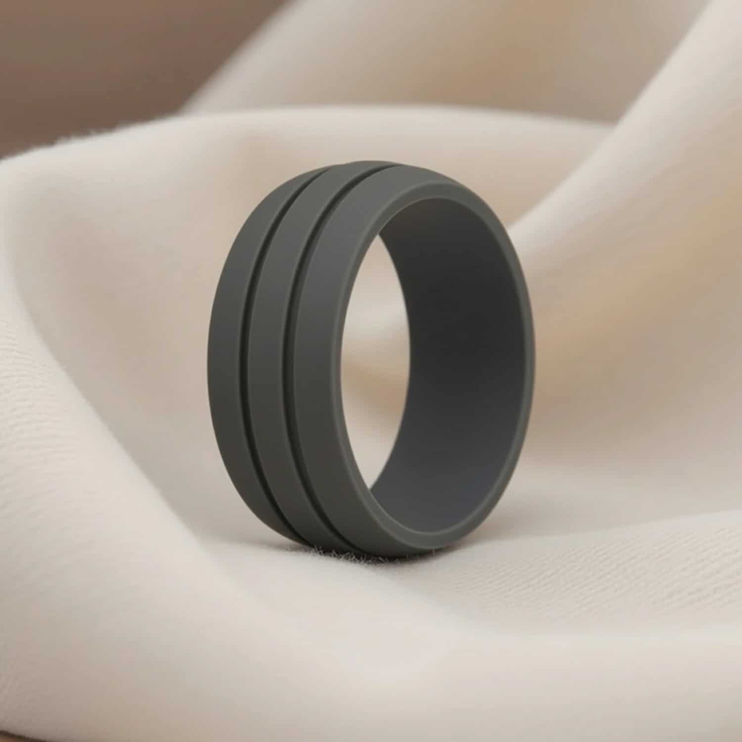 Medical-grade silicone in dark grey at 8mm. Safe through the environments where metal rings are a hazard.