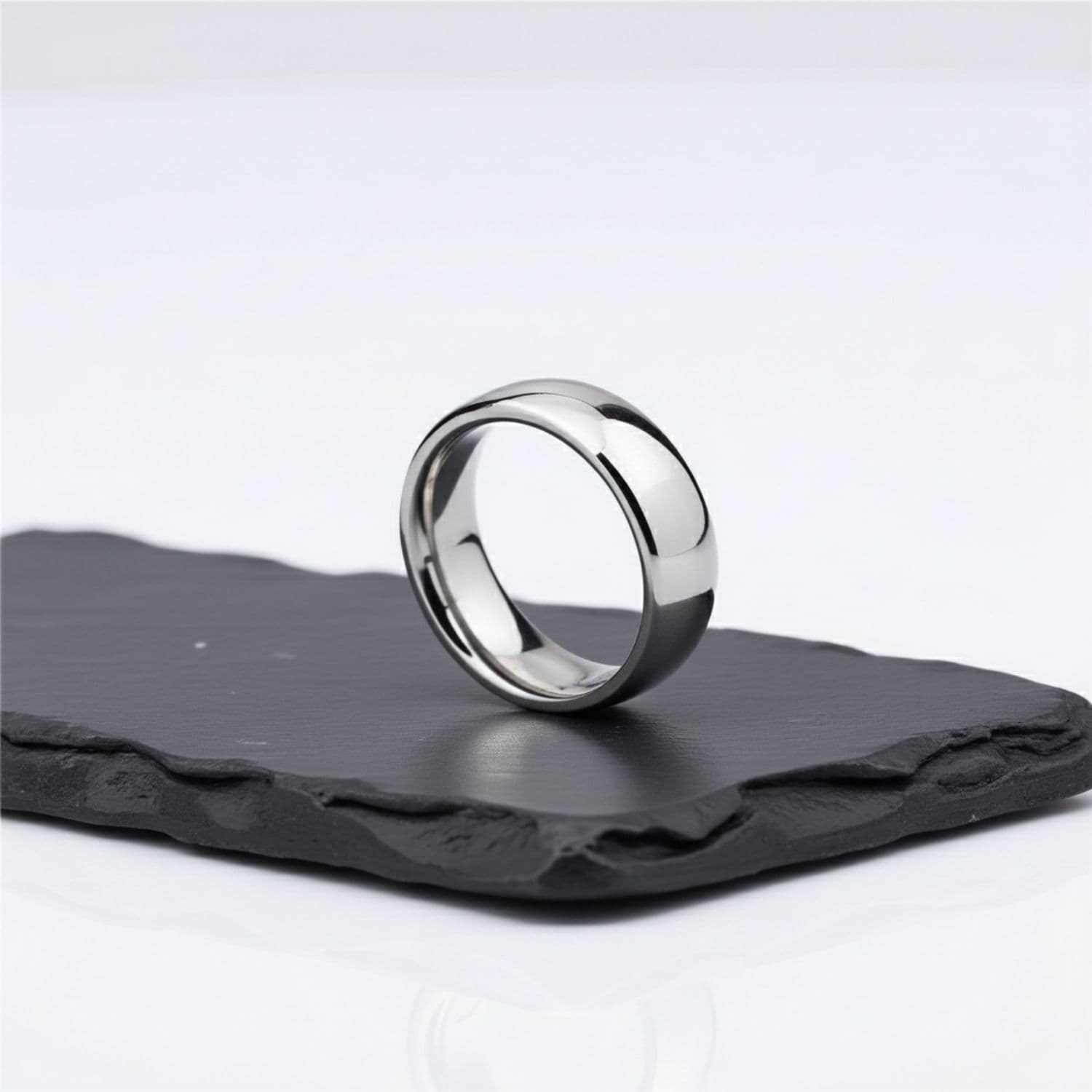 A polished silver titanium band. No grooves, no inlays, no texture — just a clean, bright, mirror-finish surface from edge to edge. The comfort-fit interior is curved to slide over the knuckle without catching. Available in 6mm for a slimmer, more understated profile, or 8mm for buyers who want more presence on the hand.