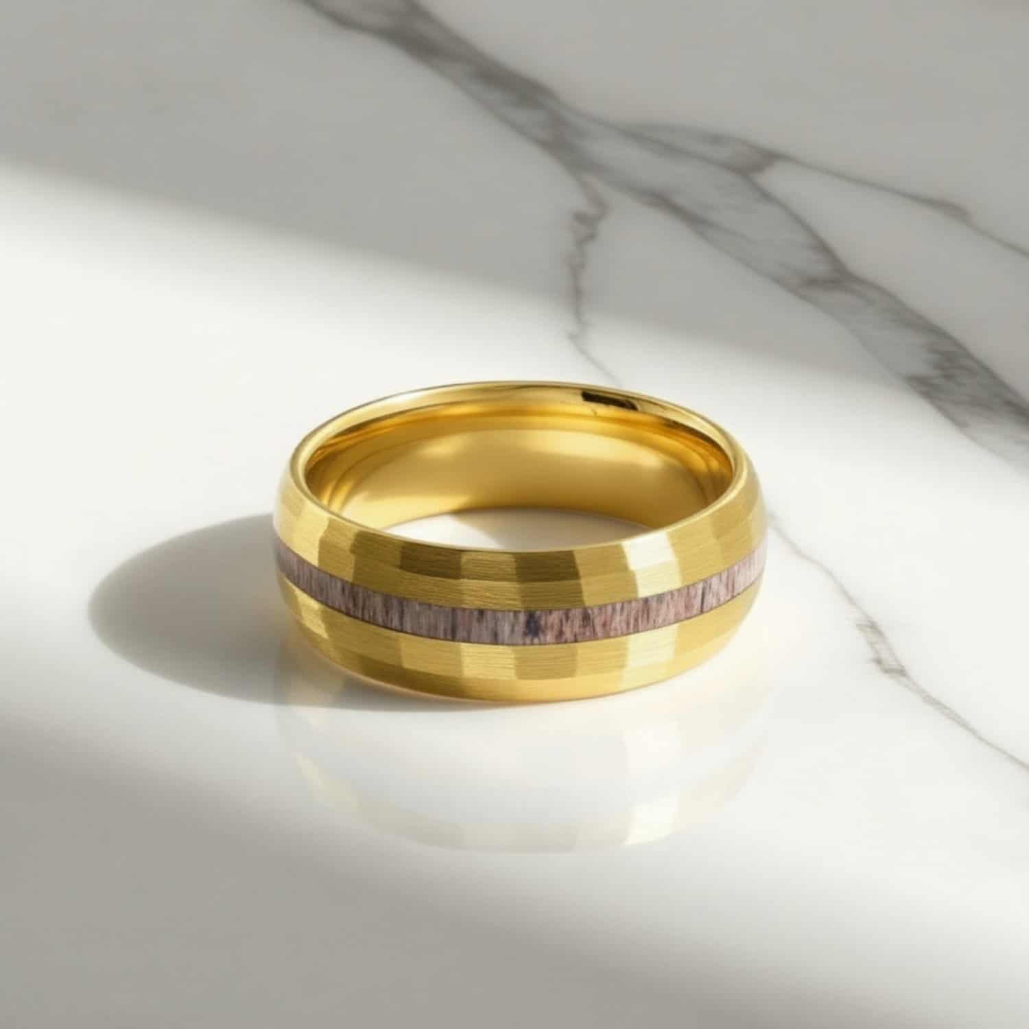 The Splendour ring is a truly distinctive men’s gold tungsten band, finished with a hammered effect that reflects light from every angle. Adding to its uniqueness, this remarkable ring features an inlay of natural antler bone — a striking combination of elegance and rugged individuality. Durable, eye-catching, and unlike anything else, it’s a gent’s band designed to stand out.