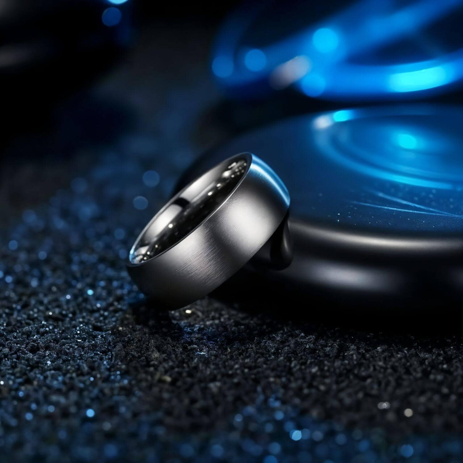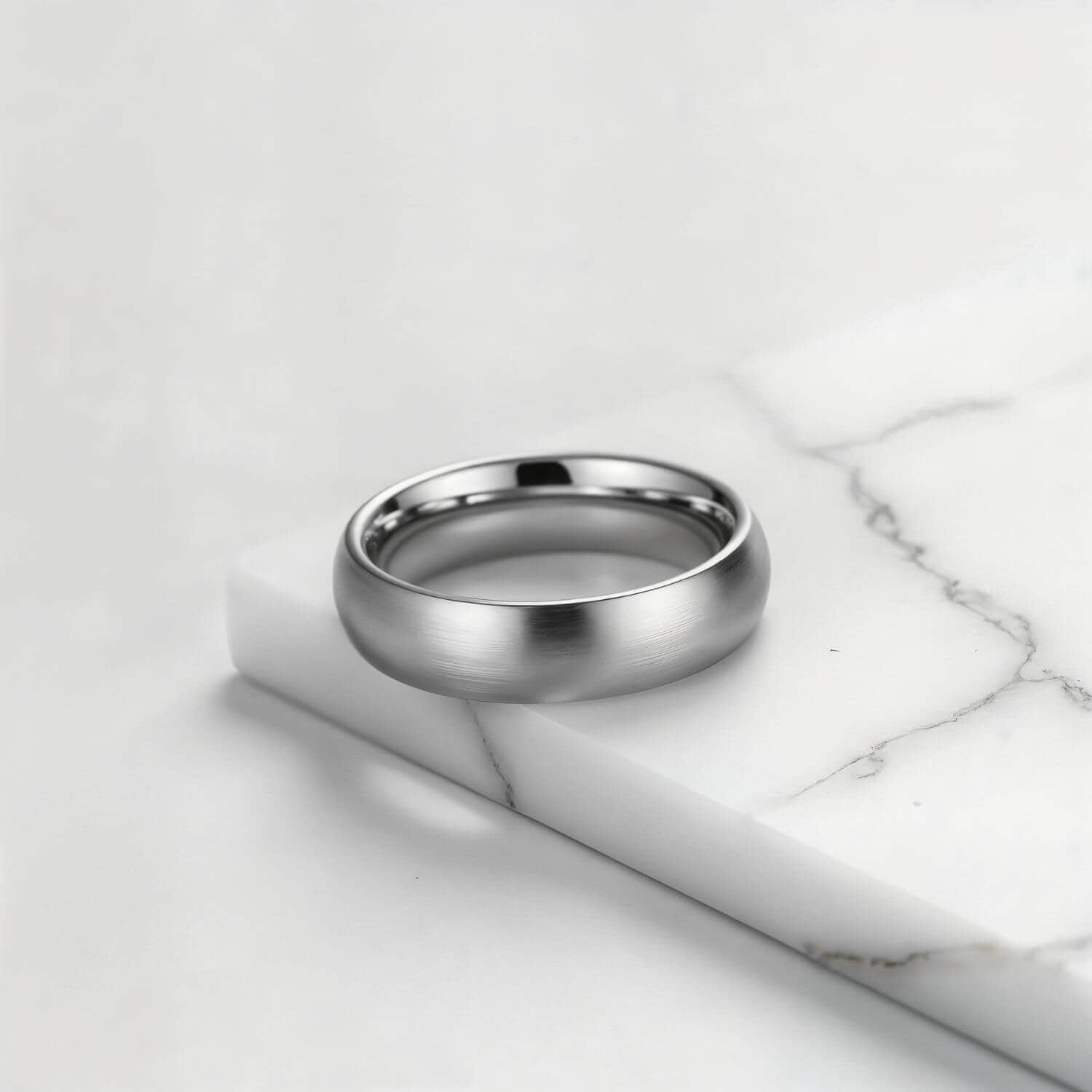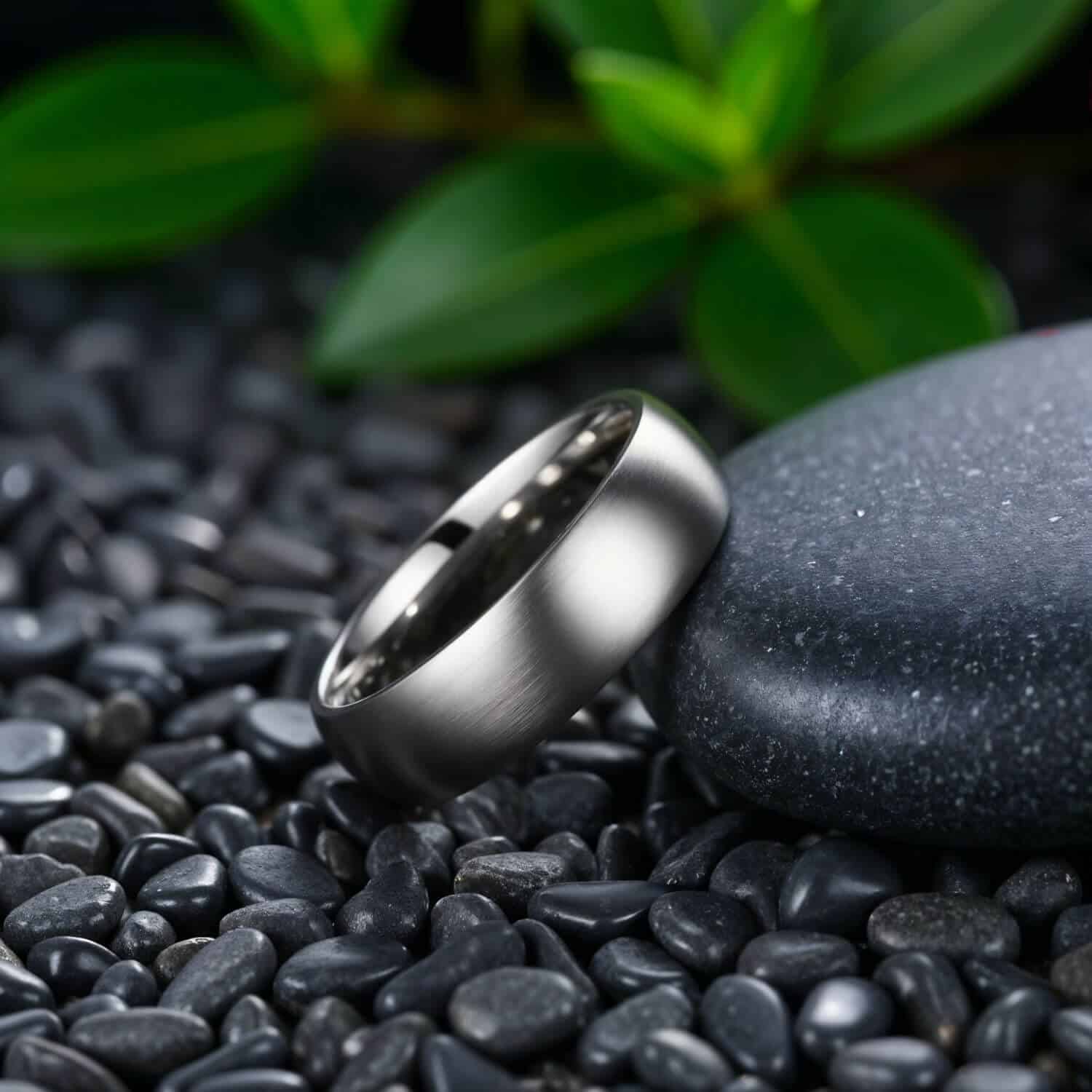 Titanium sits at 6 on the Mohs hardness scale — harder than gold, platinum, and silver. It’s roughly 50% lighter than most traditional ring metals, which means you feel it when you put it on and then forget it’s there within minutes.
