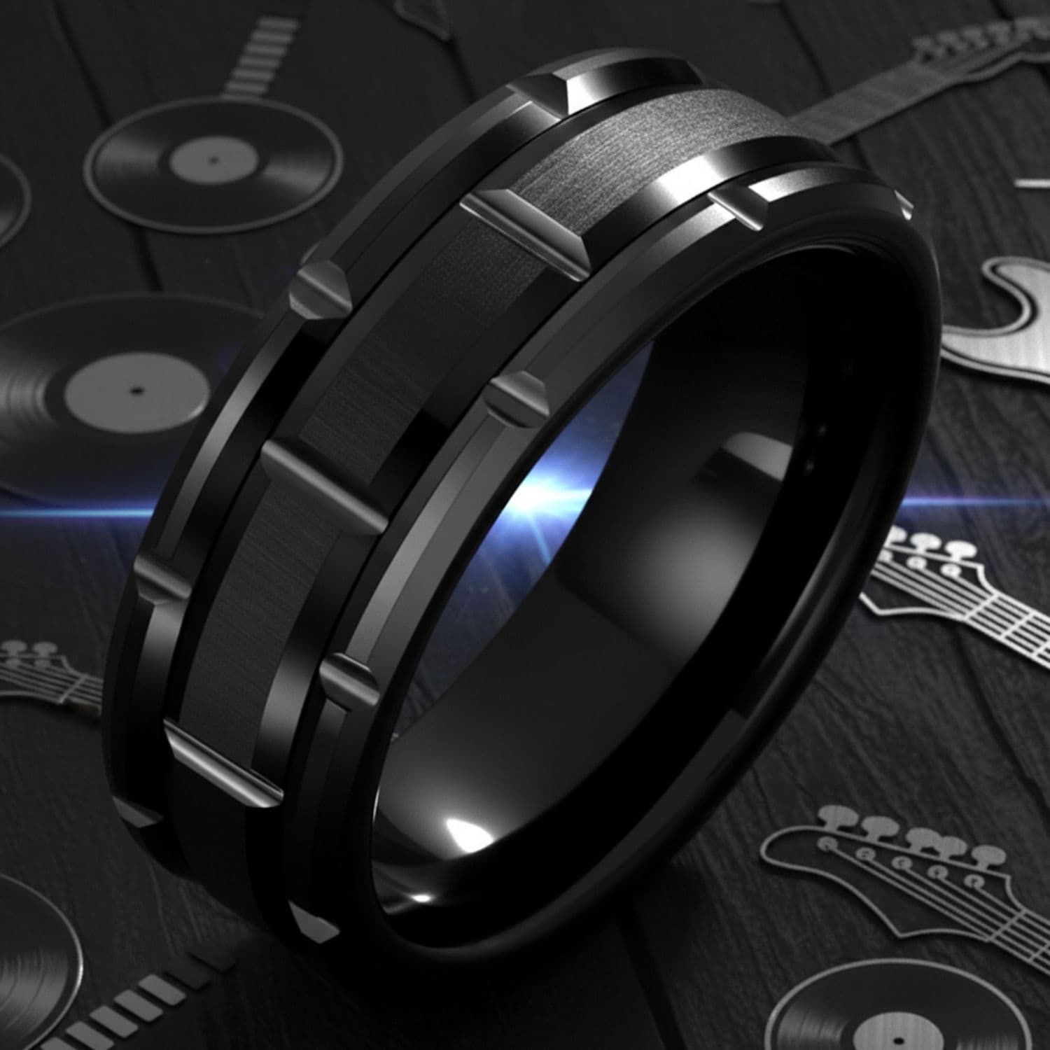 The Tyrone is a bold mens tungsten ring in sleek black, designed with a distinctive tyre-inspired brick pattern that sets it apart. Combining brushed and polished finishes, this unique mens band makes a strong statement whether worn daily, given as a special gift, or chosen as a mens wedding ring, engagement ring, eternity ring or promise band. Engraving and personalisation are available, offering a chance to add your own meaning to its striking design.