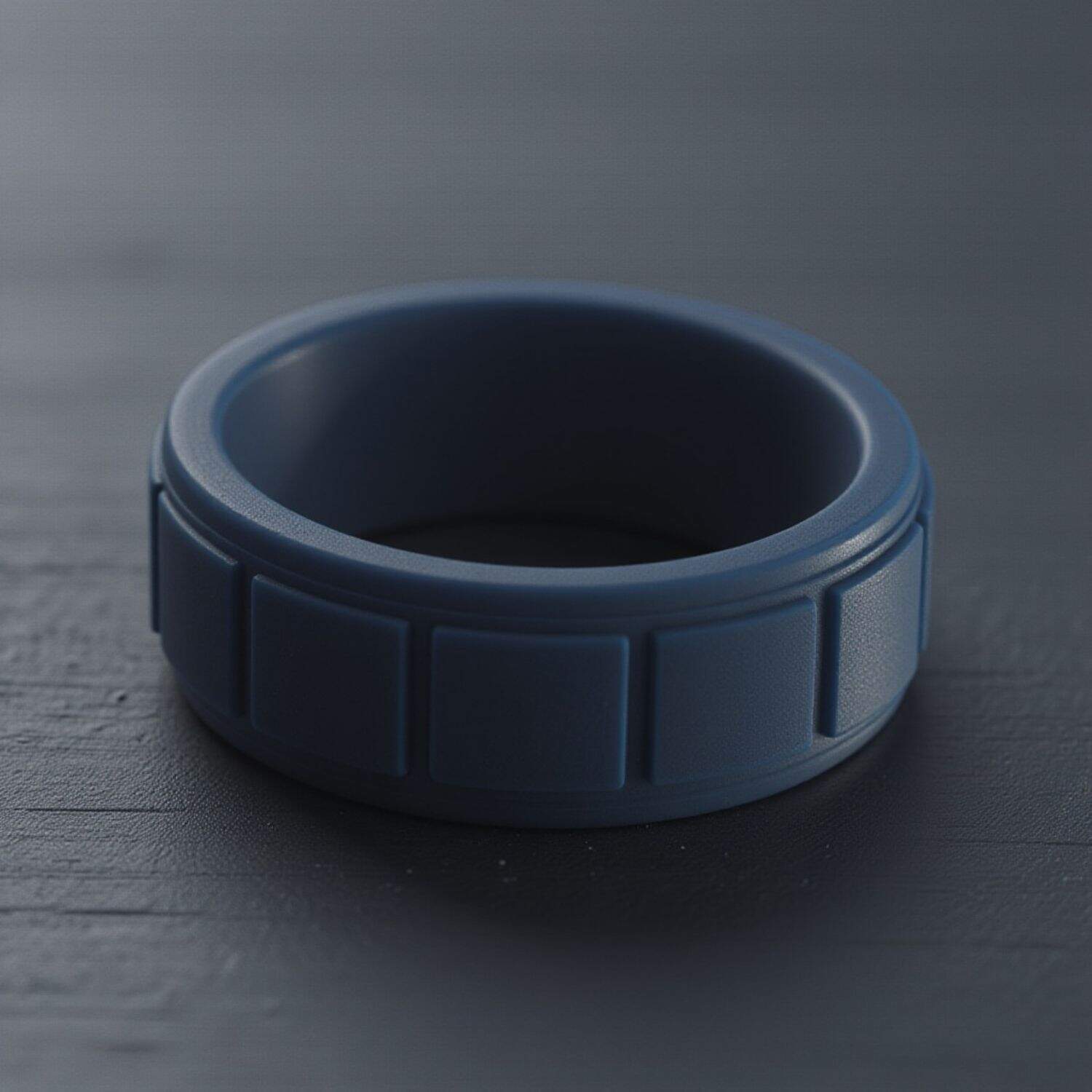 A navy blue medical-grade silicone band at 8mm. Medical-grade silicone: hypoallergenic, flexible, MRI-safe, and safe in environments where metal rings are a hazard. A silicone ring in navy blue for buyers who chose colour in their practical ring: safe through every physical environment.