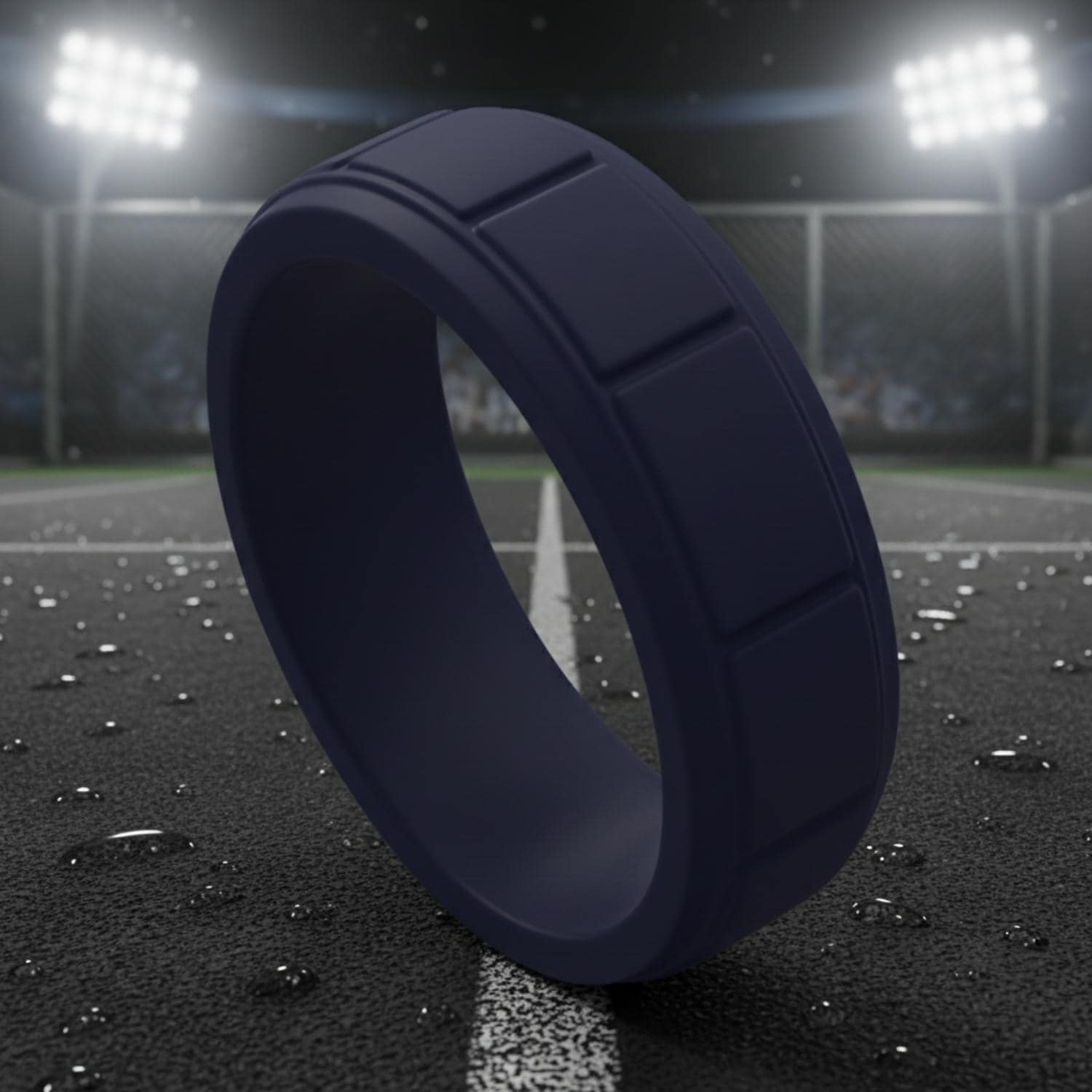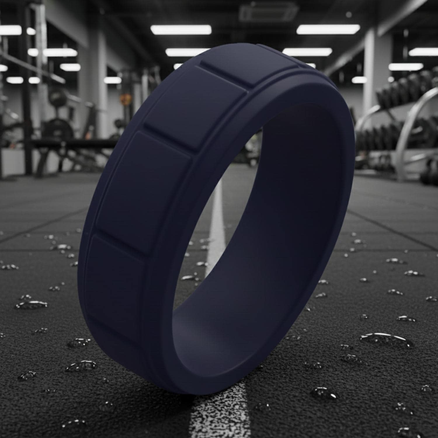 Medical-grade silicone in navy blue at 8mm. Safe through every environment where a metal ring would be a hazard.