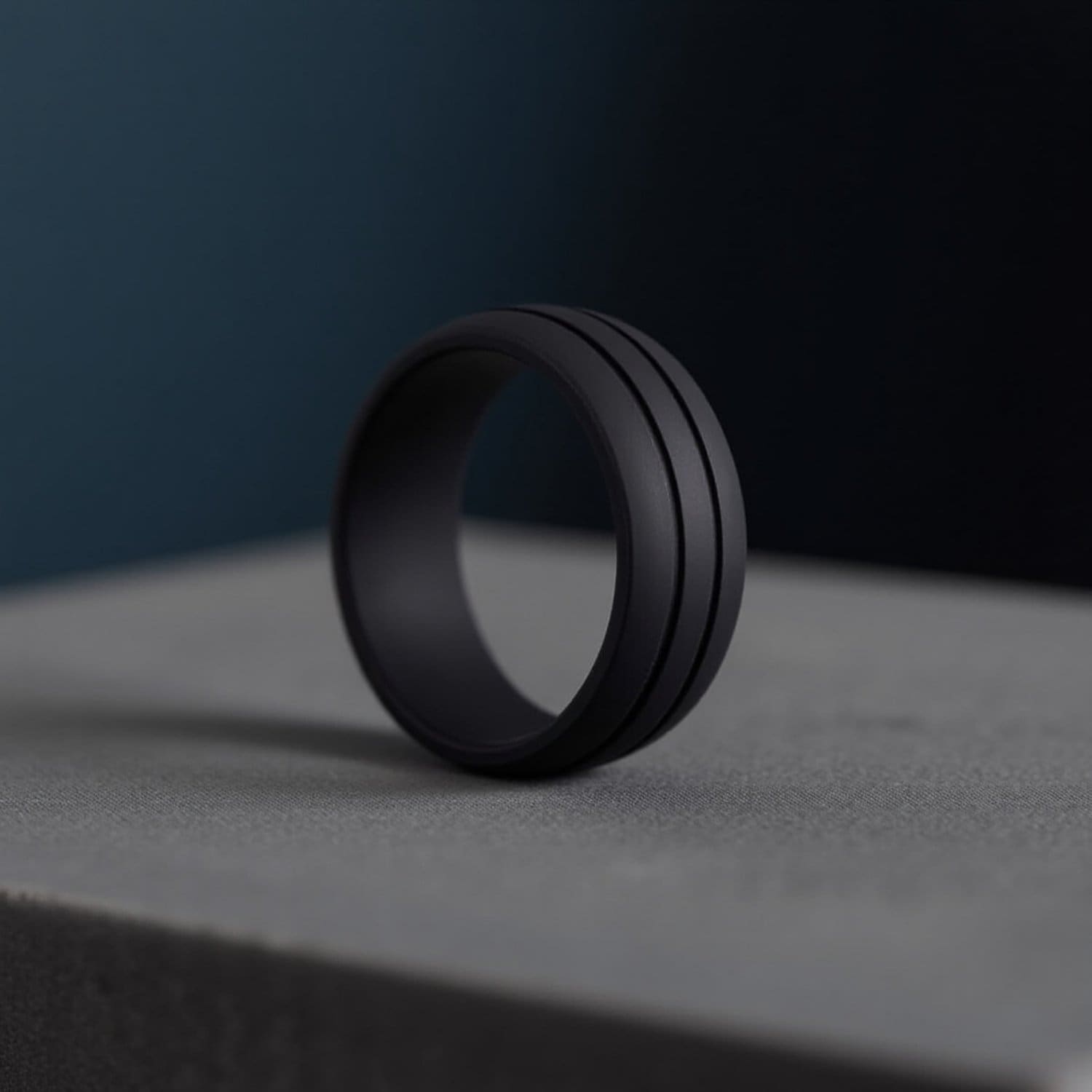 The Vigour is a black silicone ring at 8mm. The wider width gives it more presence on the hand than the 6mm options while keeping all the practical advantages of silicone.